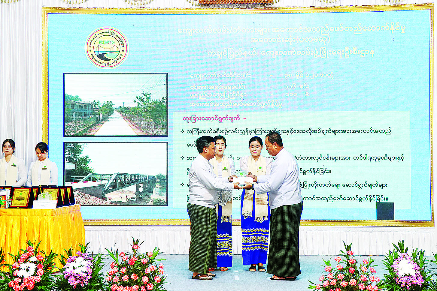 ထို့နောက် ပြည်ထောင်စုဝန်ကြီးက နိုင်ငံတော်မှပေးအပ်ချီးမြှင့်သည့် ဘွဲ့၊ တံဆိပ်ရရှိသူများ၊ စပါး အထွက်တိုးဆု၊ ကျေးလက်ဖွံ့ဖြိုးရေးဘက်စုံထူးချွန် ဆု၊ ဌာန၏လုပ်ငန်းစဉ်များအပေါ် အကောင်းဆုံး အကောင်အထည်ဖော်နိုင်မှုဆု၊ ကျေးလက်လမ်း၊ တံတားများ အရည်အသွေးပြည့်မီပြီး အချိန်မီပြီးစီးအောင် ဆောင်ရွက်နိုင်မှုနှင့် ဘက်စုံဖွံ့ဖြိုးတိုးတက်စေရန် ကြိုးပမ်းဆောင်ရွက်နိုင်မှုဆုနှင့် ပတ်ဝန်းကျင်စီမံခန့်ခွဲမှုကောင်းမွန်သော ကျေးရွာဆုရရှိကြသူများအား ဂုဏ်ပြုတံဆိပ်နှင့် ဂုဏ်ပြုဆုငွေများကိုလည်းကောင်း၊ နိုင်ငံ့ဝန်ထမ်းတက္ကသိုလ်နှင့် အခြားဝန်ကြီးဌာနများတွင် ဆုရရှိကြသူများအား ဂုဏ်ပြုဆုငွေများကိုလည်းကောင်း၊ ဝန်ထမ်းများအတွက် ဂျာကင်နှင့် တူညီဝတ်စုံများ၊ ဝန်ထမ်းသားသမီးများအတွက် ကျောင်းဝတ်စုံ၊ ဗလာစာအုပ်၊ ဘောပင်၊ ခဲတံစသည့် စာရေးကိရိယာများ၊ ကံစမ်းမဲပေါက်သော ဝန်ထမ်းများအတွက် ပစ္စည်းများကိုလည်းကောင်း ပေးအပ်သည်။