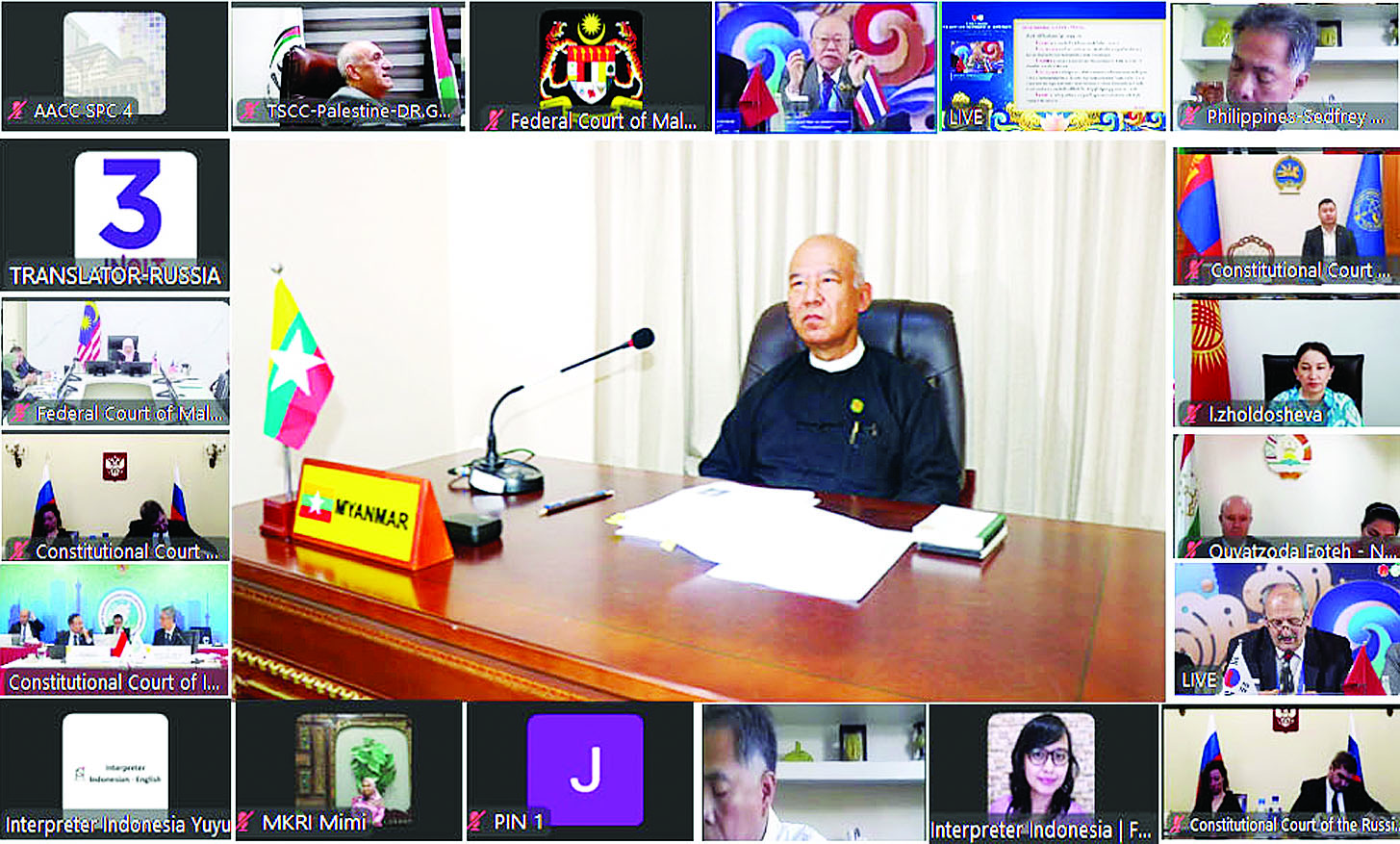 နိုင်ငံတော်ဖွဲ့စည်းပုံအခြေခံဥပဒေဆိုင်ရာခုံရုံးဥက္ကဋ္ဌ ဦးအောင်ဇော်သိန်းသည် ထိုင်းဘုရင့်နိုင်ငံ ဗန်ကောက်မြို့တွင် Video Conferencing စနစ်ဖြင့်ပြုလုပ်သည့် အာရှဖွဲ့စည်းပုံအခြေခံ ဥပဒေဆိုင်ရာတရားရုံးများနှင့် အဆင့်တူအဖွဲ့အစည်းများအသင်း (Association of Asian Constit-utional Courts and Equivalent Institutions -AACC) ၏ ဘုတ် အဖွဲ့ဝင်နိုင်ငံများ အစည်းအဝေးနှင့် စာတမ်းဖတ်ပွဲသို့ တက်ရောက်သည်။