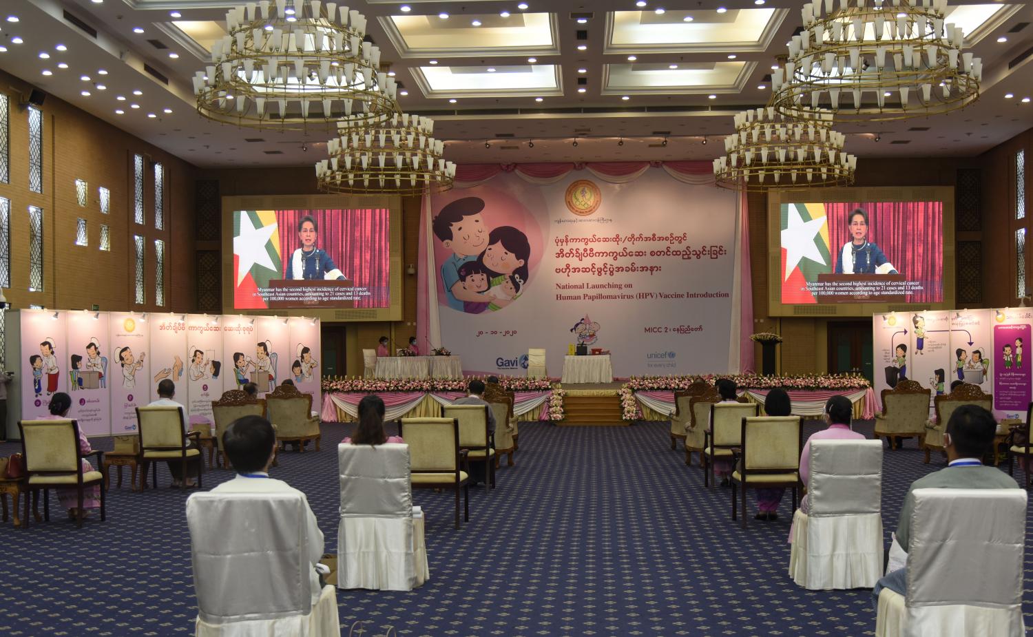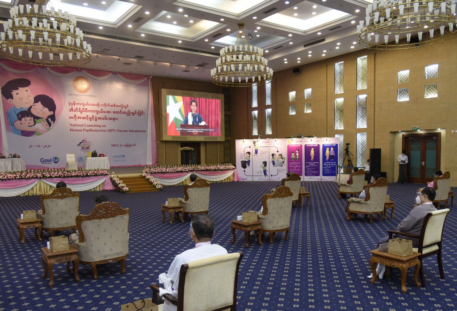 ကျန်းမာရေးနှင့် အားကစားဝန်ကြီးဌာန၏ ပုံမှန်ကာကွယ်ဆေးထိုး အစီအစဉ်တွင် အိတ်ချ်ပီဗီကာကွယ်ဆေး(Human Papillomavirus Vaccine -HPV) စတင် ထည့်သွင်း ထိုးနှံခြင်း ဗဟိုအဆင့်ဖွင့်ပွဲ အခမ်းအနားကို ယနေ့မွန်းလွဲ နာရီတွင် နေပြည်တော်ရှိ မြန်မာအပြည်ပြည်ဆိုင်ရာ ကွန်ဗင်းရှင်းဗဟိုဌာန - (MICC-2) Social Distancing ဖြင့် ကျင်းပ သည်။