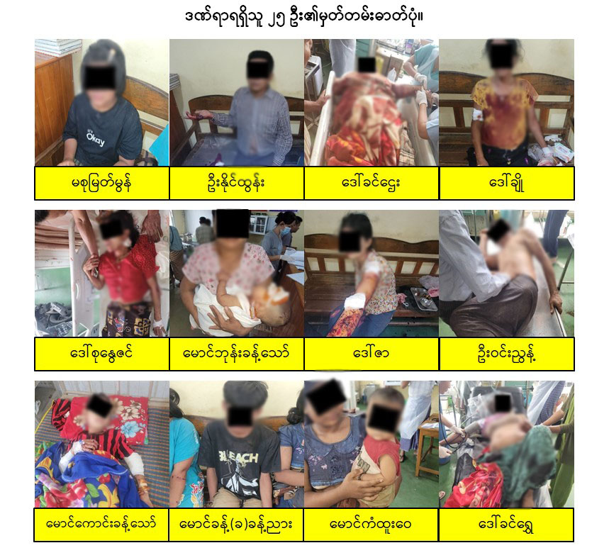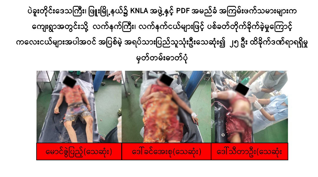 ပဲခူးတိုင်းဒေသကြီး၊ ဖြူးမြို့နယ်၌ KNLA အဖွဲ့နှင့် PDF အမည်ခံအကြမ်းဖက်သမားများက ကျေးရွာအတွင်းသို့ လက်နက်ကြီး၊ လက်နက်ငယ်များဖြင့် ပစ်ခတ်တိုက်ခိုက်ခဲ့မှုကြောင့် ကလေးငယ်များအပါအဝင် အပြစ်မဲ့အရပ်သားပြည်သူသုံးဦးသေဆုံး၍ ၂၅ ဦး ထိခိုက်ဒဏ်ရာရရှိ