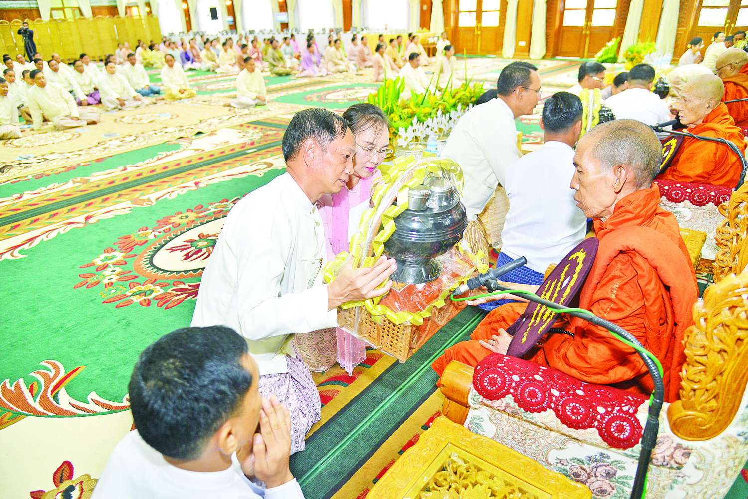 ယင်းနောက် အခမ်းအနားကို နမောတဿသုံးကြိမ်ရွတ်ဆိုဘုရားကန်တော့ ဖွင့်လှစ်၍ နိုင်ငံတော်စီမံအုပ်ချုပ်ရေးကောင်စီဥက္ကဋ္ဌ တပ်မတော်ကာကွယ်ရေးဦးစီးချုပ်နှင့် ဇနီး၊ အခမ်းအနားတက်ရောက်လာကြသူများက နိုင်ငံတော်သံဃမဟာနာယကအဖွဲ့ဥက္ကဋ္ဌ သန်လျင်မင်းကျောင်းဆရာတော်ကြီးထံမှ ကိုးပါးသီလခံယူဆောက်တည်ကြပြီး ဆရာတော်ကြီးများ ရွတ်ပွားချီးမြှင့်တော်မူသည့် မေတ္တသုတ်ပရိတ်တရားတော်များကို နာယူကြည်ညိုကြသည်။
