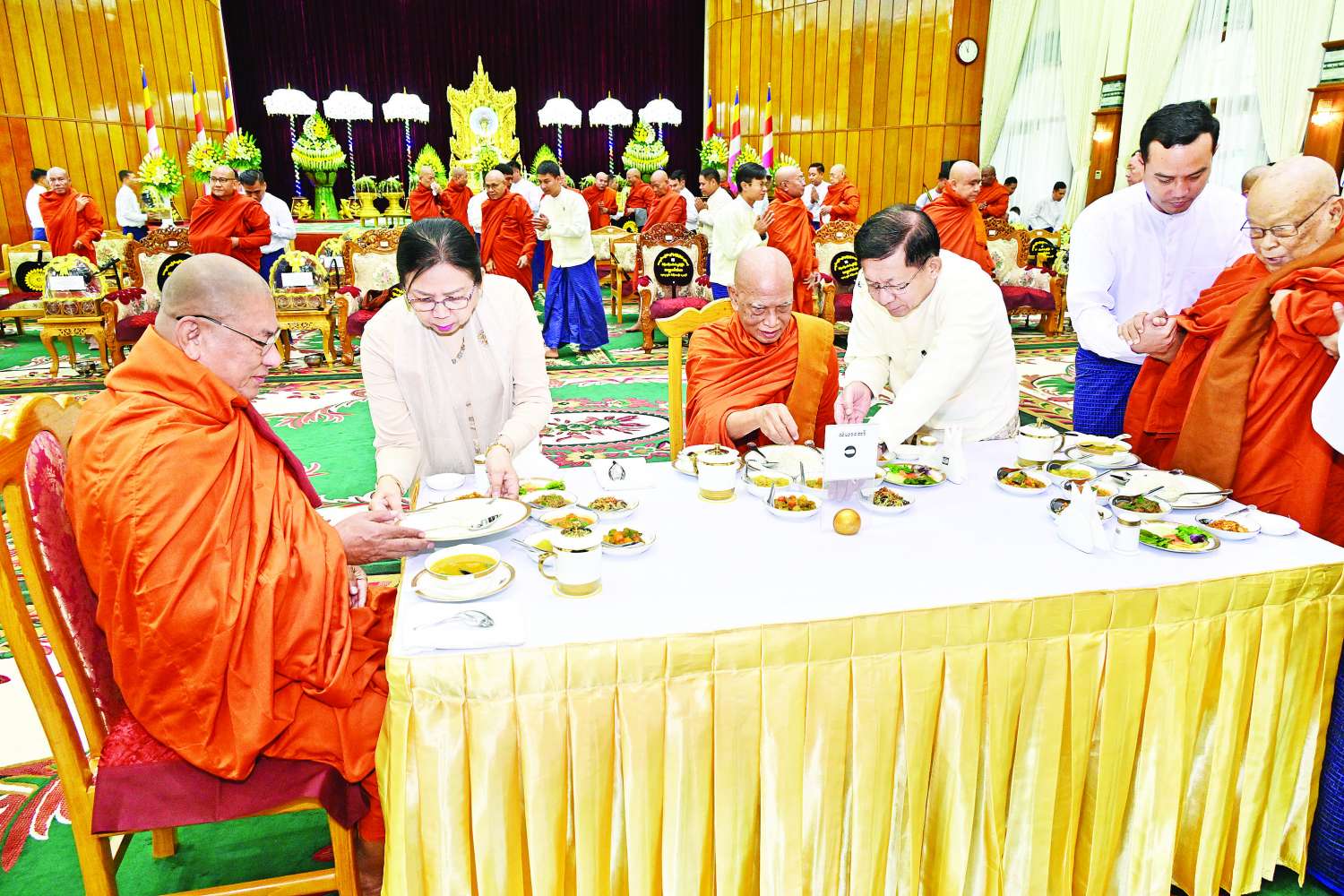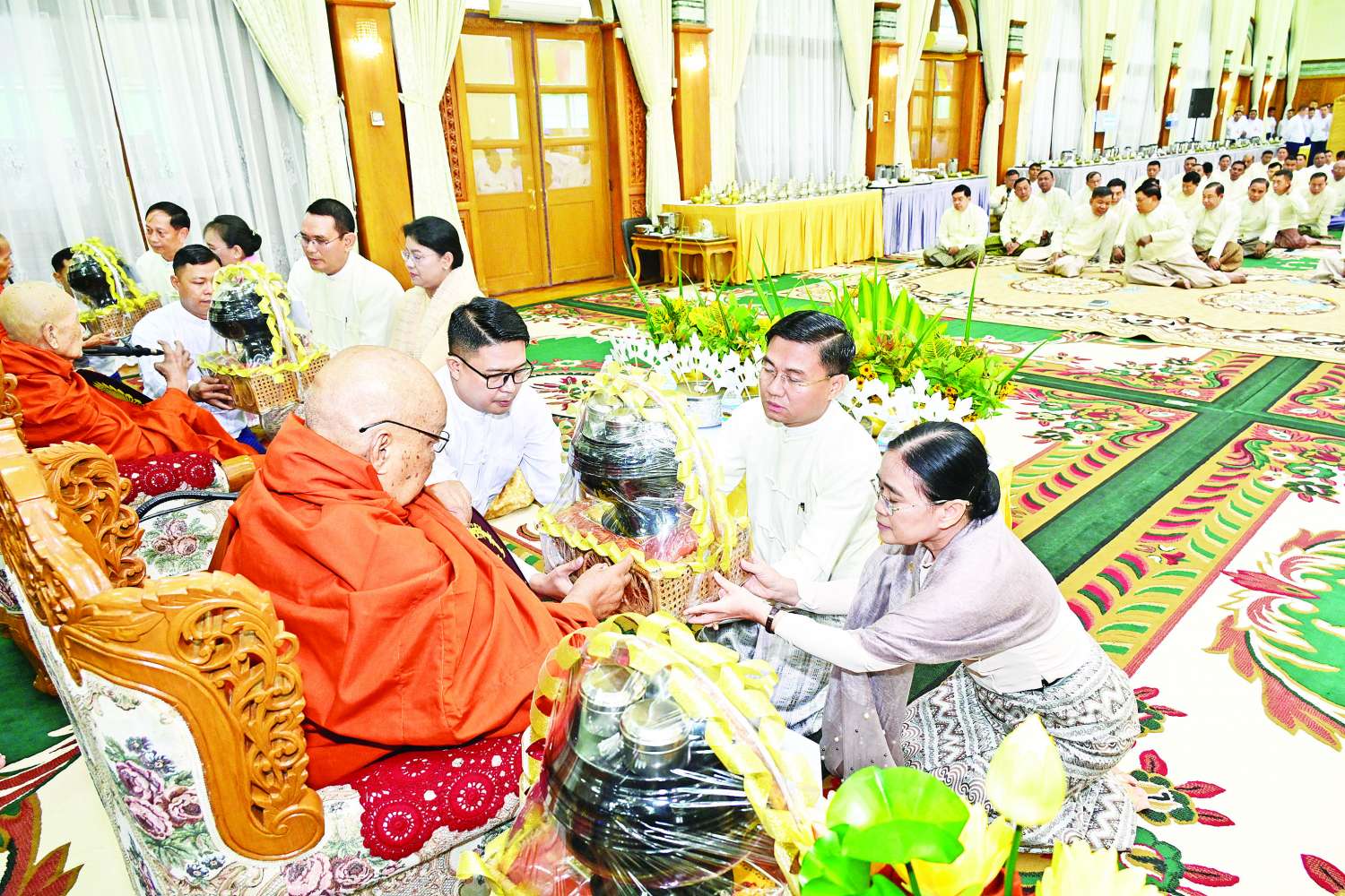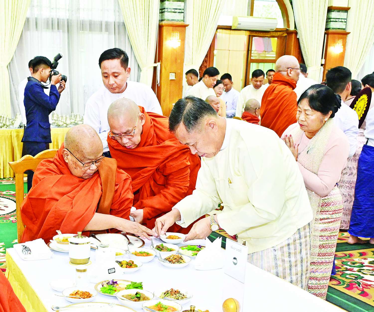 ထို့နောက် နိုင်ငံတော်စီမံအုပ်ချုပ်ရေးကောင်စီဥက္ကဋ္ဌ တပ်မတော်ကာကွယ်ရေးဦးစီးချုပ်နှင့် ဇနီးတို့က နိုင်ငံတော်သံဃမဟာနာယကအဖွဲ့ဥက္ကဋ္ဌ သန်လျင်မင်းကျောင်း ဆရာတော်ကြီးထံ ဝါဆိုသင်္ကန်းနှင့် လှူဖွယ်ပစ္စည်းများကို ဆက်ကပ်လှူဒါန်းသည်။