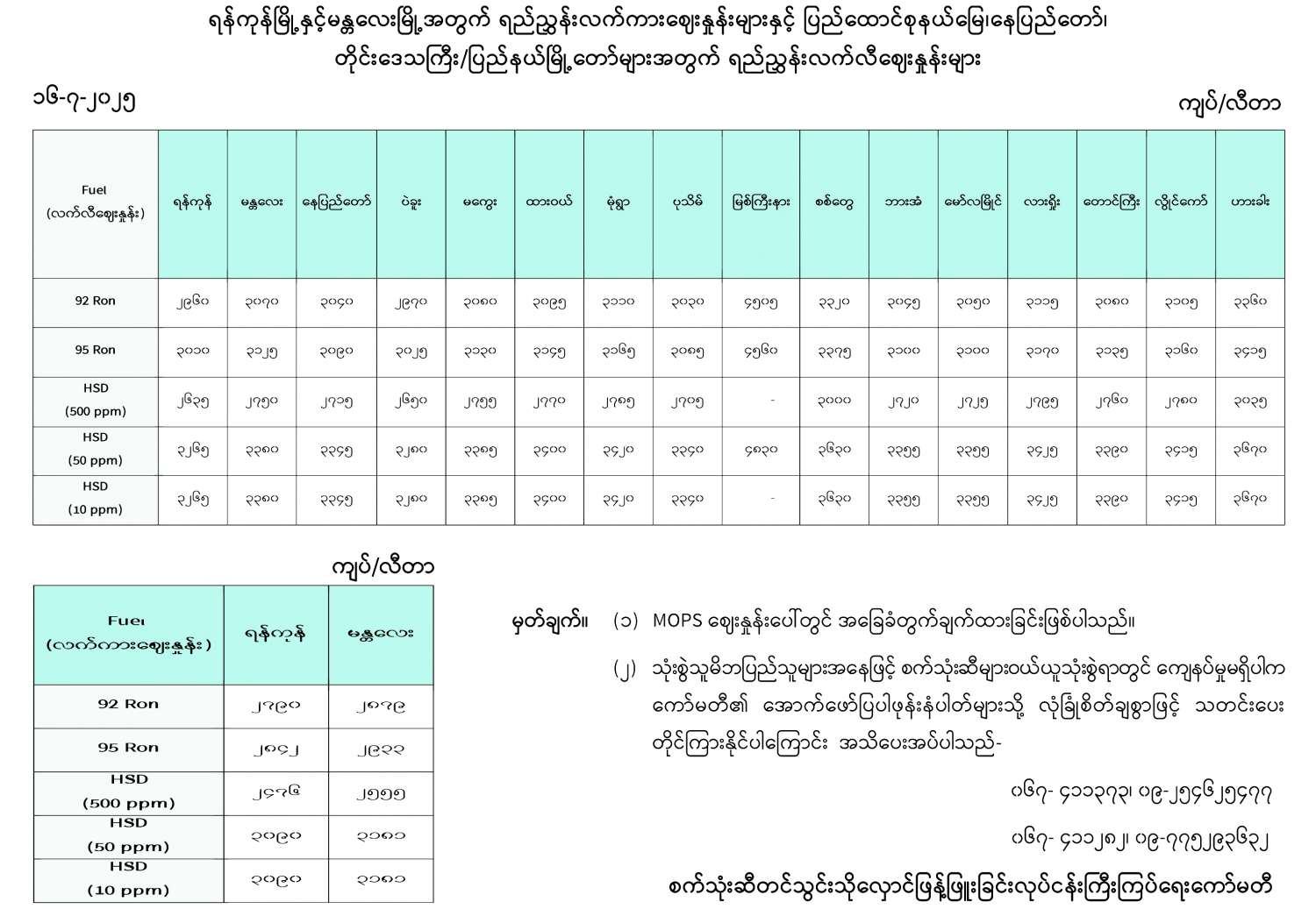 ရန်ကုန်မြို့နှင့် မန္တလေးမြို့အတွက် ရည်ညွှန်းလက်ကားဈေးနှုန်းများနှင့် ပြည်ထောင်စုနယ်မြေ နေပြည်တော်၊ တိုင်းဒေသကြီး/ပြည်နယ် မြို့တော်များအတွက် ရည်ညွှန်းလက်လီဈေးနှုန်းများ 07/16/2025