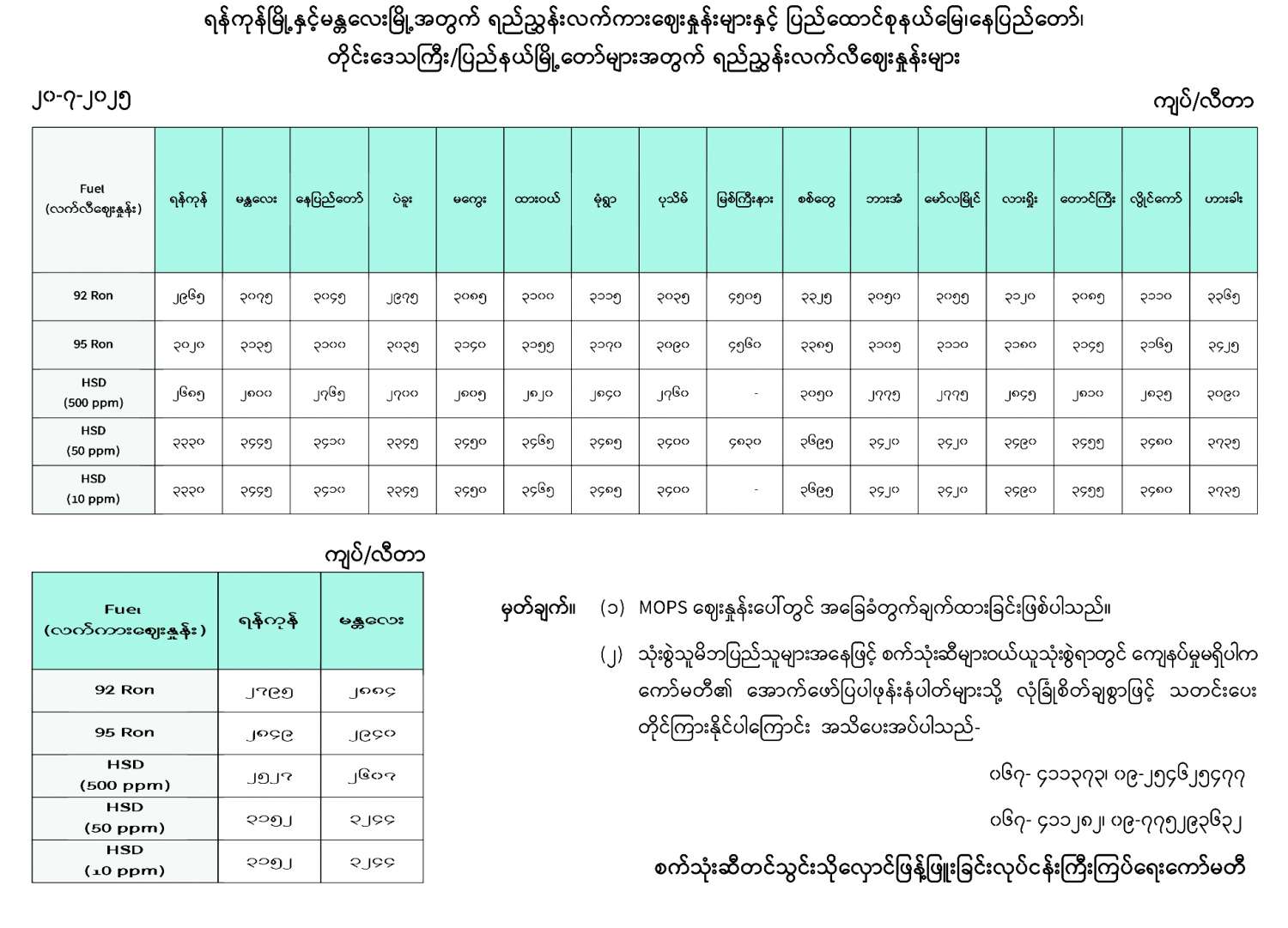 ရန်ကုန်မြို့နှင့် မန္တလေးမြို့အတွက် ရည်ညွှန်းလက်ကားဈေးနှုန်းများနှင့် ပြည်ထောင်စုနယ်မြေ နေပြည်တော်၊ တိုင်းဒေသကြီး/ ပြည်တော် မြို့တော်များအတွက် ရည်ညွှန်းလက်လီဈေးနှုန်းများ 07/20/2025