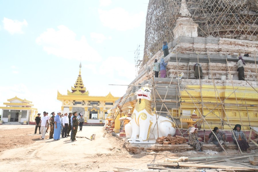 ထိုသို့ ဆောင်ရွက်ပေးလျက်ရှိရာ ယနေ့တွင် ကာကွယ်ရေးဦးစီးချုပ်ရုံး (ကြည်း) မှ ဒုတိယဗိုလ်ချုပ်ကြီး သက်ပုံနှင့် တာဝန်ရှိသူများသည် စစ်ကိုင်းမြို့ ရာဇမဏိစူဠာကောင်းမှုတော်စေတီနှင့် ဆွမ်းဦးပုညရှင်စေတီတို့၌ ငလျင်ဒဏ်ကြောင့် ထိခိုက်ပျက်စီးခဲ့သော သာသနိကအဆောက်အအုံများ ဘက်စုံပြန်လည်ပြုပြင်နေမှု၊ စစ်ကိုင်းမြို့ရှိ ဘုန်းတော်ကြီးကျောင်းတိုက်များ၌ ငလျင်ဒဏ်ကြောင့် ထိခိုက်ပျက်စီးခဲ့သော သာသနိကအဆောက်အအုံများကို အပြီးသတ်ဖယ်ရှားရှင်းလင်းနေမှုနှင့် ဘက်စုံပြန်လည်ပြုပြင်နေမှု၊ နှစ် (၇၀၀) ပြည့် အားကစားခန်းမ၌ ငလျင်ဘေးဒဏ်ကြောင့် ထိခိုက်ပျက်စီးခဲ့သည့် နေအိမ်များအတွက် အမျိုးသားသဘာဝဘေးအန္တရာယ်ဆိုင်ရာစီမံခန့်ခွဲမှုကော်မတီက ပေးအပ်သည့် ထောက်ပံ့ငွေများ ပေးအပ်နေမှုကို သွားရောက်ကြည့်ရှု၍ လိုအပ်သည်များ ညှိနှိုင်းဆောင်ရွက်ပေးသည်။