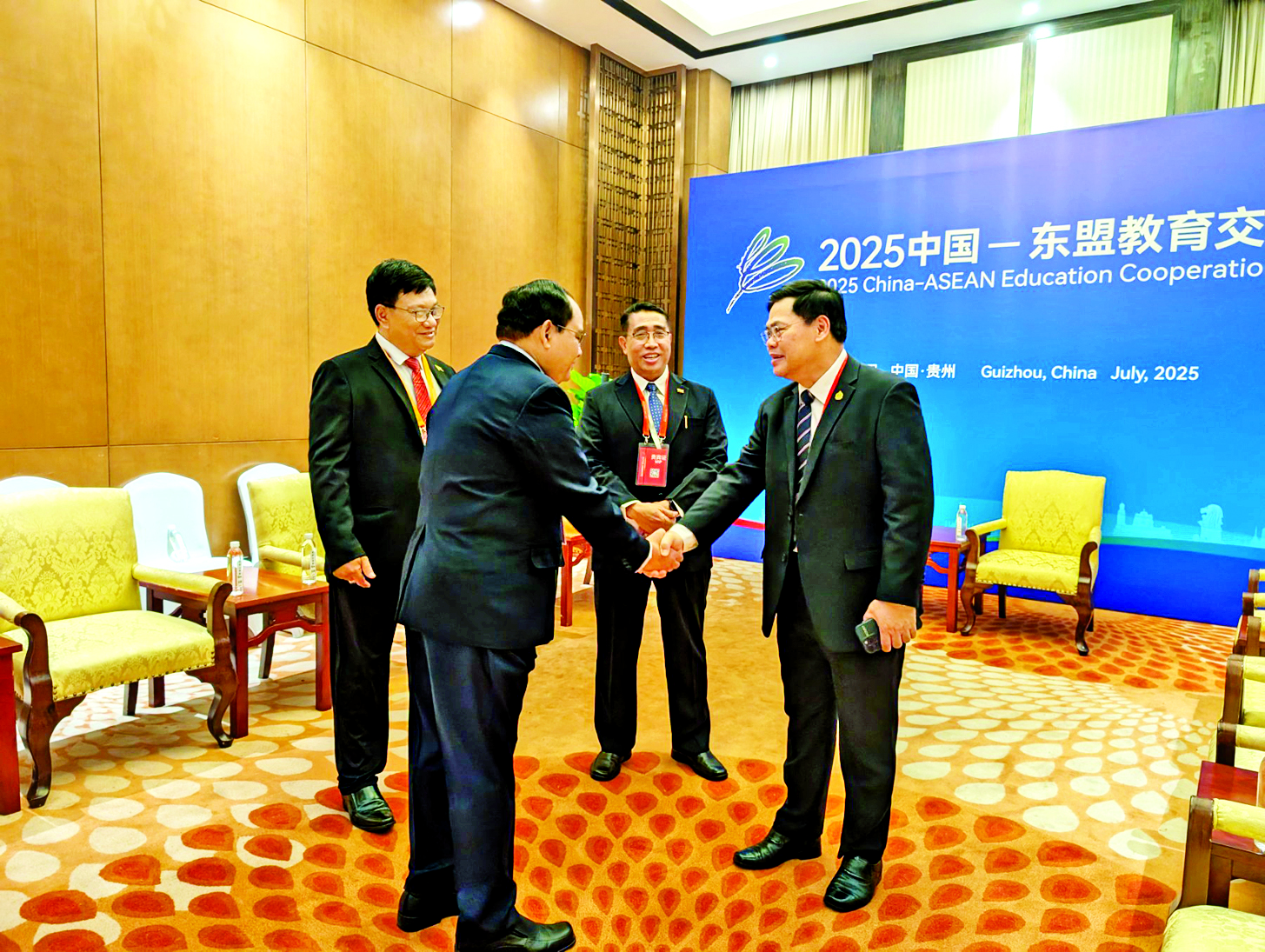 ပညာရေးဝန်ကြီးဌာန ဒုတိယဝန်ကြီး ဦးနေမျိုးလှိုင် ဦးဆောင်သော မြန်မာကိုယ်စားလှယ်အဖွဲ့သည် ၂၀၂၅ ခုနှစ် တရုတ်-အာဆီယံ ပညာရေးပူးပေါင်းဆောင်ရွက်မှု ရက်သတ္တပတ်အခမ်းအနား တက်ရောက်ရန်အတွက် တရုတ်ပြည်သူ့သမ္မတနိုင်ငံ ကွေ့ကျိုးပြည်နယ် ကွေ့ရမ်မြို့သို့ ဇူလိုင် ၂၄ ရက်တွင် ရောက်ရှိသည်။
