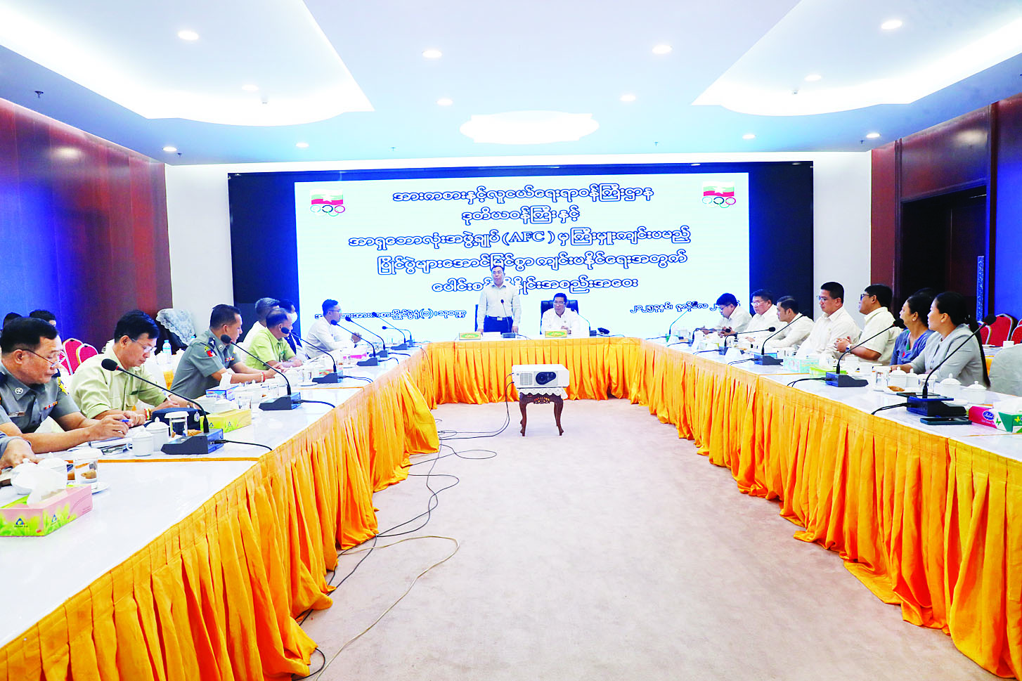 အစည်းအဝေးတွင် ဒုတိယဝန်ကြီးက မြန်မာနိုင်ငံအနေဖြင့် ဩဂုတ်လအတွင်း အာရှဘောလုံးအဖွဲ့ချုပ် (AFC) က ကြီးမှူးကျင်းပမည့် ဘောလုံးပြိုင်ပွဲ လေးမျိုးကို အိမ်ရှင်အဖြစ် လက်ခံကျင်းပသွားမည်ဖြစ်၍ အဆိုပါပြိုင်ပွဲများ အောင်မြင်စွာ ကျင်းပပြုလုပ်နိုင်ရေးအတွက် လုံခြုံရေး၊ သွားလာနေထိုင်စားသောက်ရေး၊ အုပ်ချုပ်မှုနှင့် ယာဉ်လမ်းကြောင်းပိတ်ဆို့မှုများ မဖြစ်ပေါ်စေရေးတို့ကို သက်ဆိုင်ရာဌာနများက အလေးထားဆောင်ရွက်ပေးစေလိုကြောင်း၊ ထို့ပြင် ပြိုင်ပွဲများ အောင်မြင်စွာ လက်ခံကျင်းပနိုင်ရေးအတွက် ရန်ကုန်တိုင်းဒေသကြီးအစိုးရအဖွဲ့၊ သက်ဆိုင်ရာဝန်ကြီးဌာနများ၊ မြန်မာနိုင်ငံဘောလုံးအဖွဲ့ချုပ်တို့က ဝိုင်းဝန်းကူညီပံ့ပိုးပြီး ပူးပေါင်းညှိနှိုင်းဆောင်ရွက်ပေး စေလိုကြောင်း ပြောကြားသည်။