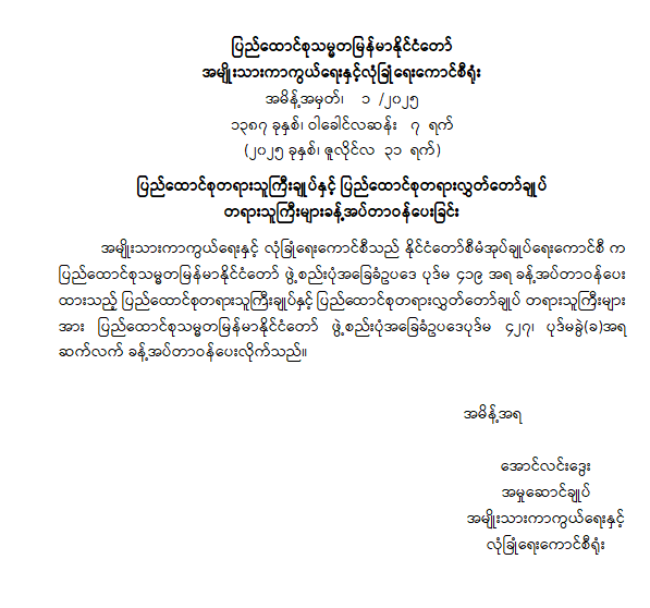 ပြည်ထောင်စုတရားသူကြီးချုပ်နှင့် ပြည်ထောင်စုတရားလွှတ်တော်ချုပ် တရားသူကြီးများ ခန့်အပ်တာဝန်ပေးခြင်း 07/31/2025