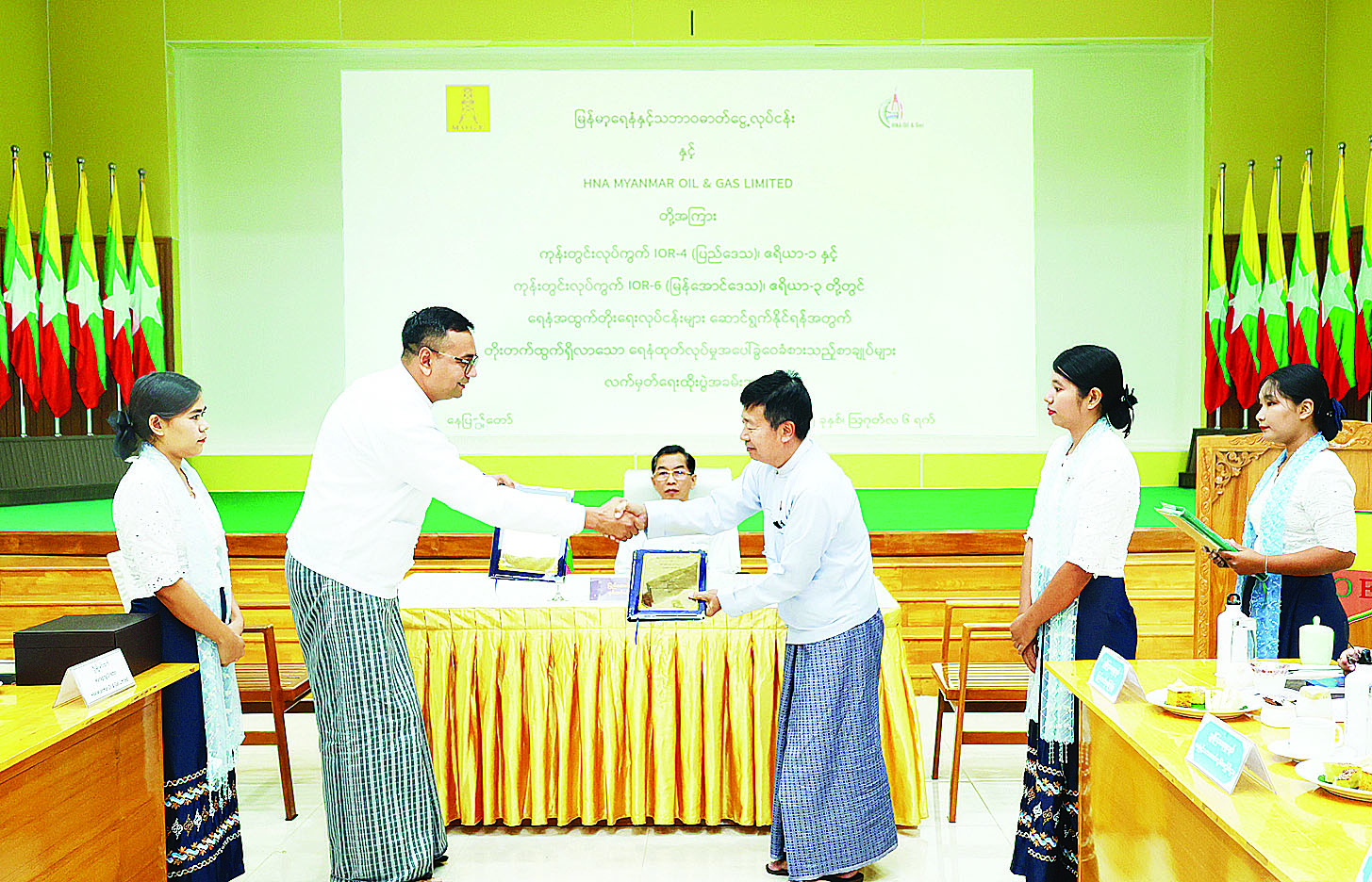 ထို့နောက် HNA Myanmar Oil & Gas Ltd. နှင့် Future Engineering & Gold, Mining Co., ltd., တို့မှ တာဝန်ရှိသူများက တိုးတက်ထွက်ရှိလာသော ရေနံနှင့်သဘာဝဓာတ်ငွေ့ထုတ်လုပ်မှုအပေါ် ခွဲဝေခံစားသည့်စာချုပ်များချုပ်ဆိုနိုင်ခဲ့ခြင်းအတွက် ကျေးဇူးတင်စကားပြောကြားပြီး တာဝန်ရှိသူများက တိုးတက်ထွက်ရှိလာသော ရေနံနှင့်သဘာဝဓာတ်ငွေ့ ထုတ်လုပ်မှုအပေါ် ခွဲဝေခံစားသည့်စာချုပ်များကို လက်မှတ်ရေးထိုးခဲ့ကြောင်း သိရသည်။