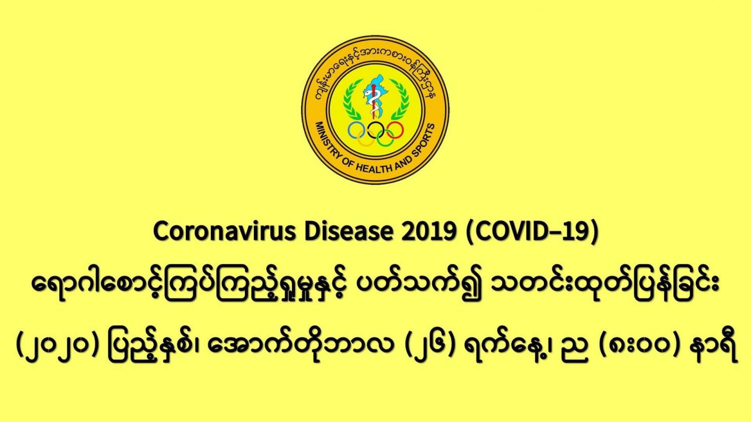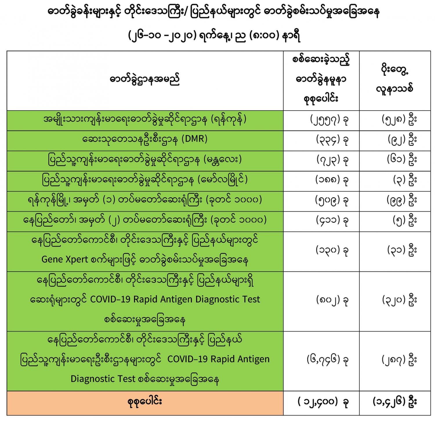 (၂၅-၁၀-၂၀၂၀) ရက်နေ့၊ ည (၈:၀၀) နာရီမှ (၂၆-၁၀-၂၀၂၀) ရက်နေ့၊ ည (၈:၀၀) နာရီ အတွင်း ဓာတ်ခွဲနမူနာ စုစုပေါင်း (၁၂,၄၀၀) ခုအား စစ်ဆေးပြီးစီးခဲ့ရာ COVID-19 ရောဂါ ဓာတ်ခွဲ အတည်ပြု လူနာသစ် (၁,၄၂၆)ဦး တွေ့ရှိရပါသည်။