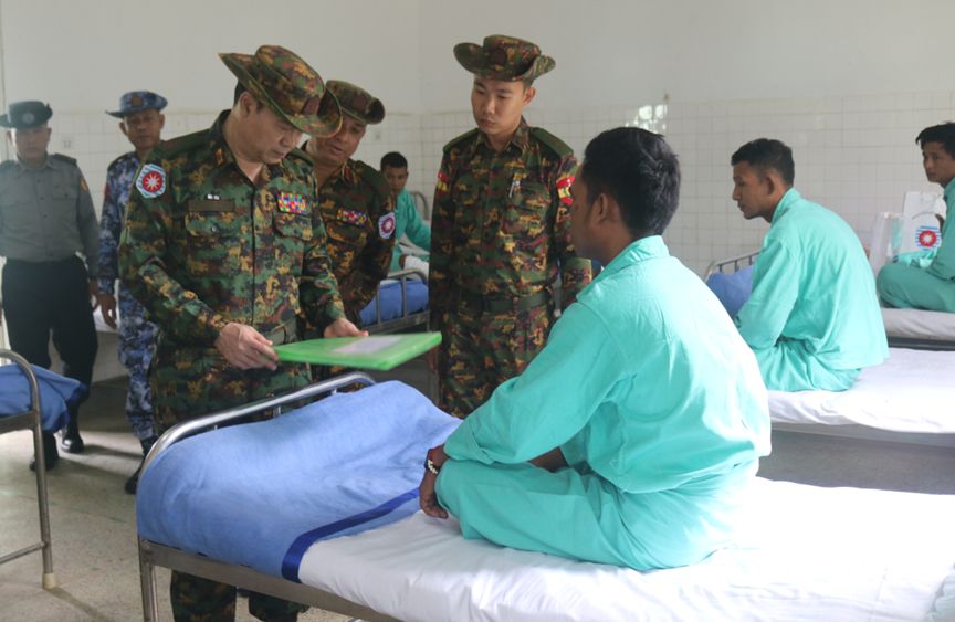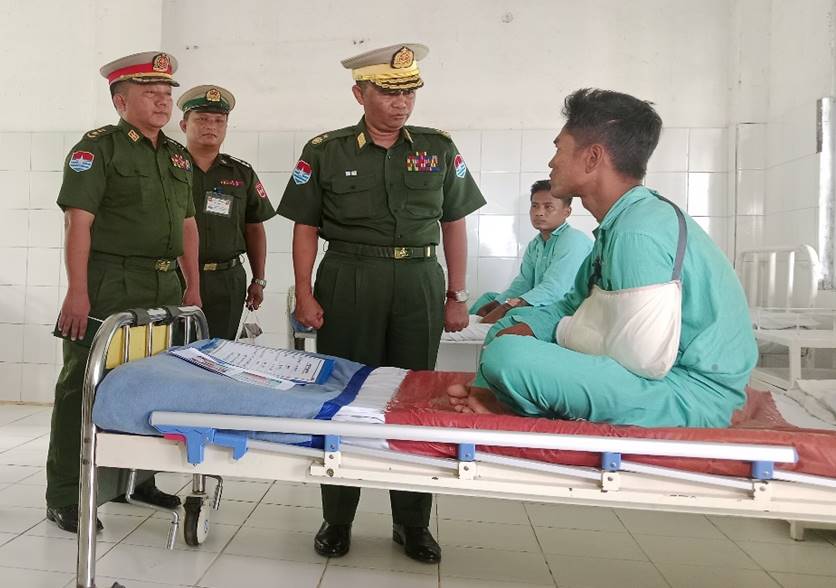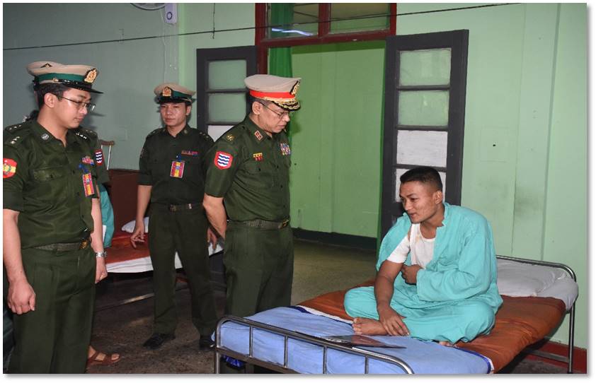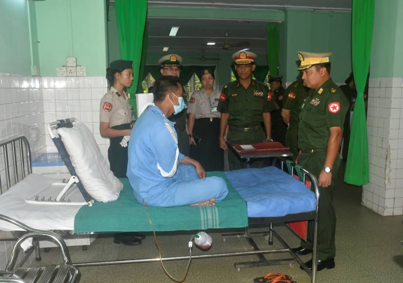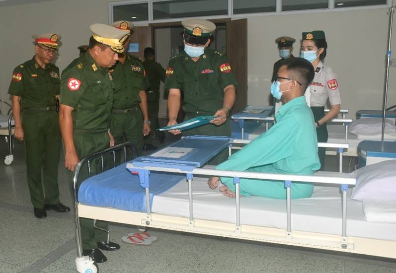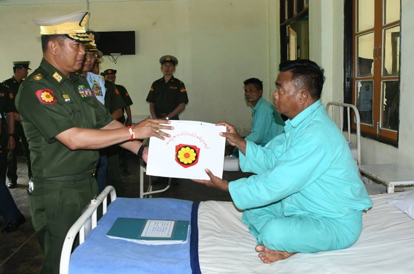 ကချင်ပြည်နယ်၊ မြစ်ကြီးနားမြို့ရှိတပ်မတော်ဆေးရုံ၊ ရှမ်းပြည်နယ်(တောင်ပိုင်း)၊ နမ့်စန်မြို့ရှိ တပ်မတော်ဆေးရုံ၊ တနင်္သာရီတိုင်းဒေသကြီး၊ ဘုတ်ပြင်းမြို့ရှိ တပ်မတော်ဆေးရုံ၊ ရန်ကုန်တိုင်းဒေသကြီး၊ မင်္ဂလာဒုံမြို့နယ်ရှိ တပ်မတော်အရိုးရောဂါ အထူးကုဆေးရုံကြီး(ခုတင်-၅၀၀)နှင့် တပ်မတော်ဆေးရုံကြီး(ခုတင်-၁၀၀၀)၊ ဧရာဝတီတိုင်းဒေသကြီး၊ ပုသိမ်မြို့ရှိ နယ်မြေခံဆေးတပ်ရင်း၊ ရခိုင်ပြည်နယ်၊ စစ်တွေမြို့ရှိတပ်မတော်ဆေးရုံ၊ မန္တလေးတိုင်းဒေသကြီး၊ မန္တလေးမြို့၊ နန်းမြို့တွင်းရှိ တပ်မတော်ဆေးရုံတို့၌ တက်ရောက်ဆေးကုသမှုခံယူလျက်ရှိသော အရာရှိ၊ စစ်သည်၊ မိသားစုဝင်များ၊ မြန်မာနိုင်ငံရဲတပ်ဖွဲ့ဝင်များ၊ ပြည်သူ့စစ်(ဌာနေ)တပ်ဖွဲ့ဝင်များ၊ စစ်မှုထမ်းဟောင်းအဖွဲ့ဝင်များနှင့် ဒေသခံပြည်သူများအား ယနေ့တွင် သက်ဆိုင်ရာတိုင်းစစ်ဌာနချုပ်များမှ တိုင်းမှူးများနှင့် တာဝန်ရှိသူများက သွားရောက်ကြည့်ရှု၍ တစ်ဦးချင်း၏ ရောဂါဖြစ်ပွားမှု၊ ဆေးဝါးကုသပေးထားမှုနှင့် ကျန်းမာရေးတိုးတက်ကောင်းမွန်မှုအခြေအနေများကို မေးမြန်းအားပေးစကား ပြောကြားပြီး အာဟာရဖြည့်စားသောက်ဖွယ်ရာများနှင့် ချီးမြှင့်ငွေများပေးအပ်ကာ ဆရာဝန်၊ သူနာပြုများအား ချီးမြှင့်ငွေများပေးအပ်ကြသည်။