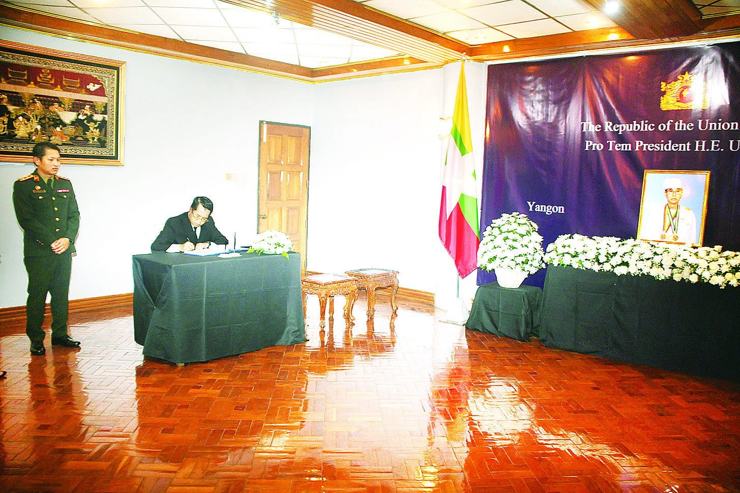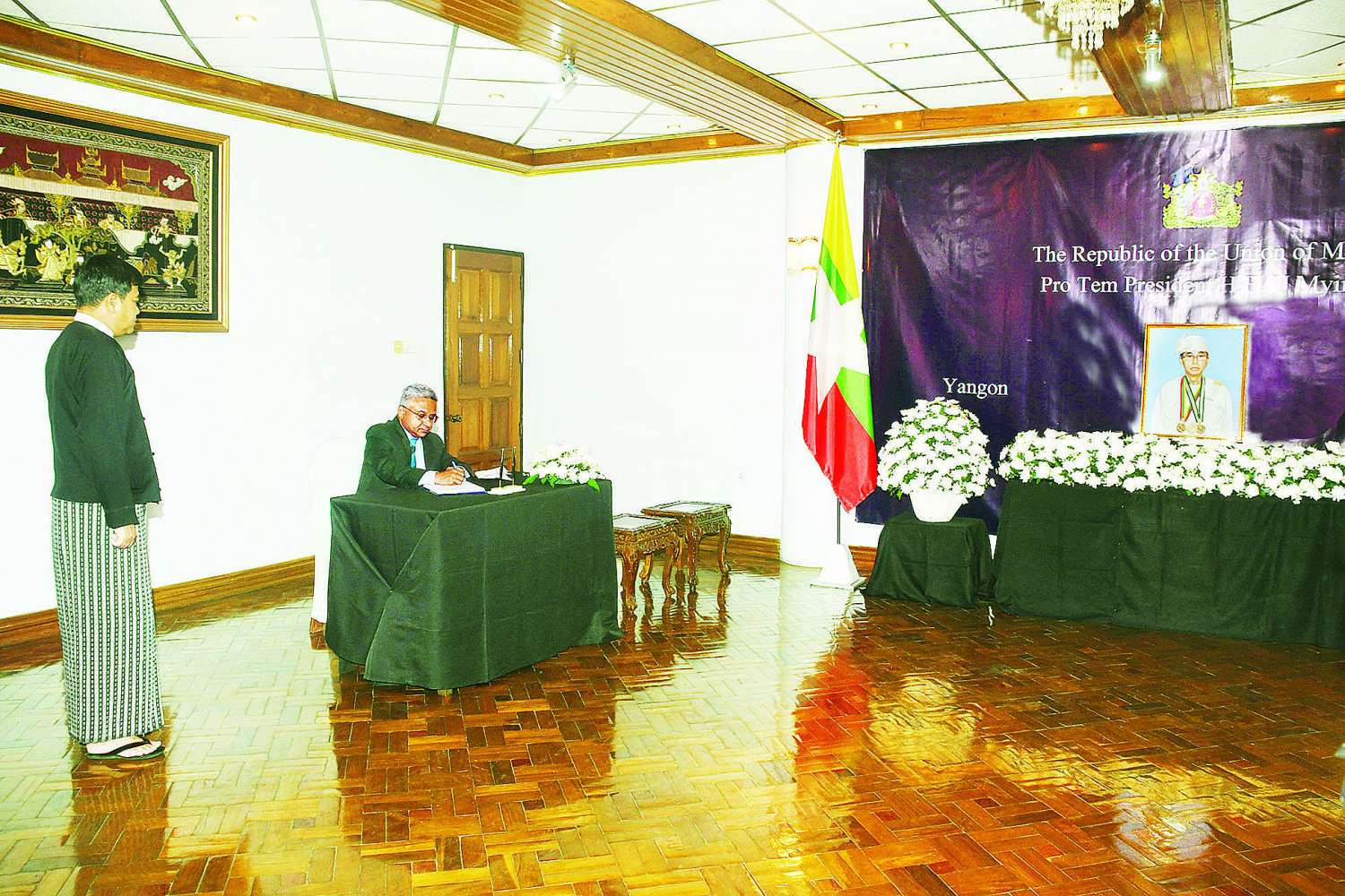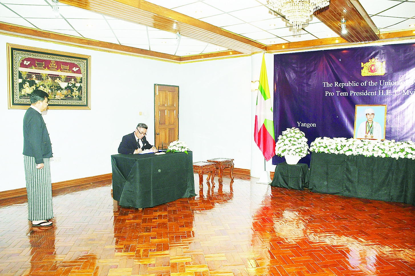 ပြည်ထောင်စုသမ္မတမြန်မာနိုင်ငံတော်၊ ယာယီသမ္မတဦးမြင့်ဆွေ ကွယ်လွန်ခြင်းအတွက် ဝမ်းနည်းကြောင်း မှတ်တမ်းစာအုပ်တွင် ရန်ကုန်မြို့အခြေစိုက်သံရုံးများမှ သံအမတ်ကြီးများနှင့် သံရုံးအကြီးအကဲများက လက်မှတ်ရေးထိုး