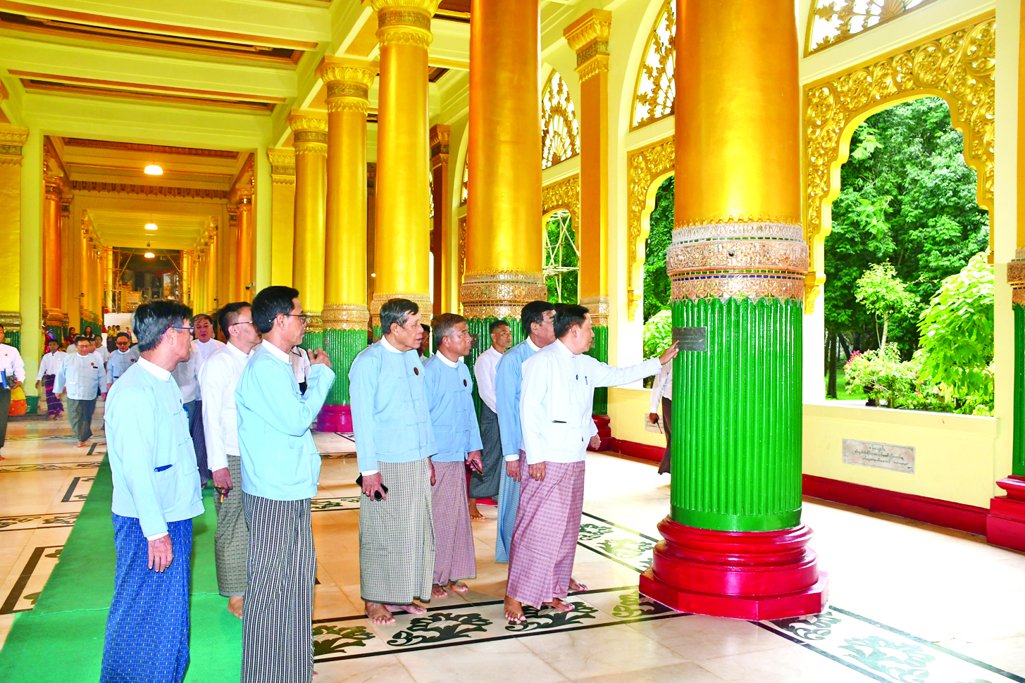 ထို့နောက် စေတီတော်ရင်ပြင်ဆီမီးခုံများရှိ မြန်မာမှုစဉ့်ပန်းများ ထိန်းသိမ်းဆောင်ရွက်နေမှု၊ အနောက်ဘက်စောင်းတန်းရင်ပြင် မှန်စီရွှေချတိုင်လုံးများရှိ အလှူရှင်ကမ္ပည်းကြေးပြားများ ရောင်တော်ဖွင့်ဆောင်ရွက်နေမှု၊ ချမ်းသာကြီးတန်ဆောင်းနှင့် ဦးဘိုးသောင်းတန်ဆောင်းအတွင်းရှိ တိုင်လုံးများတွင် အင်္ဂတေဖောင်းကြွပန်းများဖြင့် မြန်မာမှုဆန်ဆန် ပြုပြင်ဆောင်ရွက်နေမှုနှင့် ဦးဝိဇ္ဇာ+ဒေါ်မင်းပု တန်ဆောင်းရှိကြမ်းခင်းများ ပြုပြင်ဆောင်ရွက်နေမှုတို့ကို လှည့်လည်ကြည့်ရှုစစ်ဆေးပြီးလိုက်နာ ဆောင်ရွက်ရန်လိုအပ်သည့် လုပ်ငန်းပိုင်းဆိုင်ရာများကို ဆွေးနွေးမှာကြားသည်။