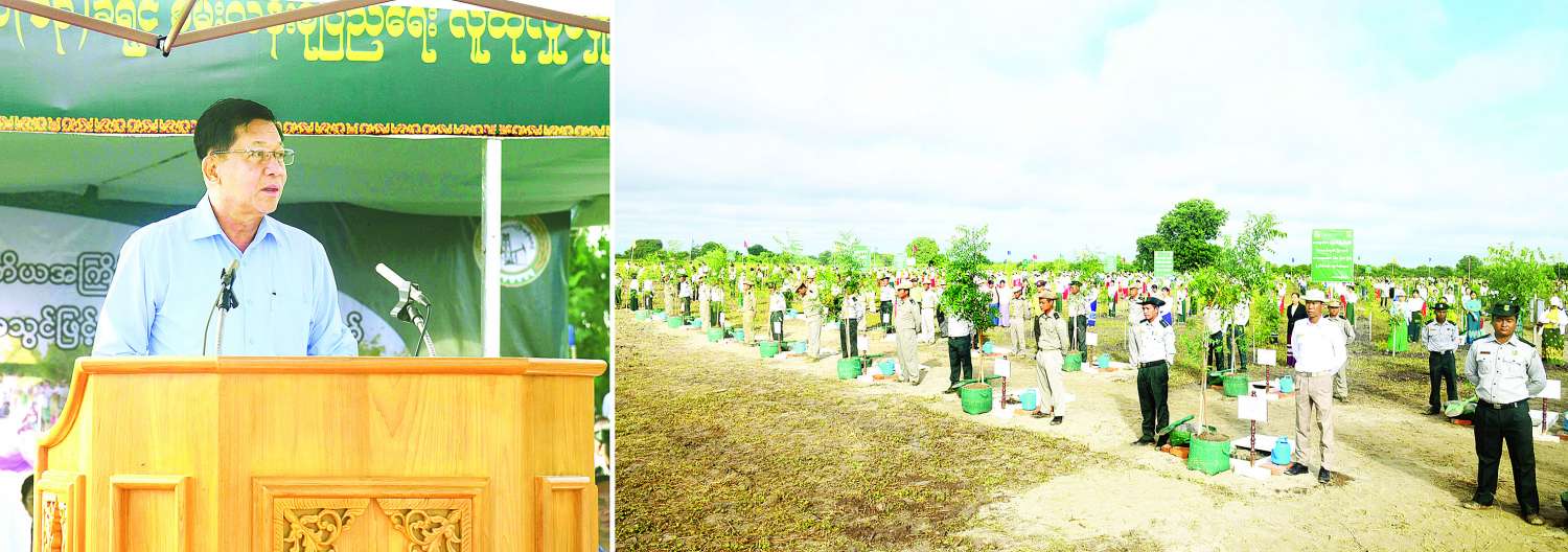 ဦးစွာ နိုင်ငံတော်လုံခြုံရေးနှင့် အေးချမ်းသာယာရေးကော်မရှင်ဥက္ကဋ္ဌက အပူပိုင်းဒေသ(၁၃)ခရိုင်အတွင်း ၂၀၂၅ ခုနှစ် ဒုတိယအကြိမ် မိုးရာသီလူထုလှုပ်ရှားမှုအသွင်ဖြင့် သစ်ပင်စိုက်ပျိုးပွဲတော်များ ကျင်းပရခြင်းနှင့်ပတ်သက်၍ အမှာစကားပြောကြားရာတွင် နှစ်စဉ်မိုးရာသီကာလများတွင် သစ်ပင်စိုက်ပျိုးပွဲများကို မိမိကိုယ်တိုင်ဦးဆောင်၍ သစ်ပင်များစိုက်ပျိုးခြင်းကို ဆောင်ရွက်ပေးလျက်ရှိကြောင်း၊ အထူးသဖြင့် အပူပိုင်းဒေသများတွင် ရာသီဥတု ပိုမိုပူပြင်းလာသည်ကို သတိပြုမိသည့်အတွက် သစ်ပင်များစိုက်ပျိုးခြင်းကို ဒုတိယအကြိမ် ဆောင်ရွက်ခြင်းဖြစ်ကြောင်း၊ ဇူလိုင်လ ၁၁ ရက်နေ့ကလည်း မိတ္ထီလာခရိုင်တွင် မိမိကိုယ်တိုင်ဦးဆောင်၍ ပထမအကြိမ် သစ်ပင်စိုက်ပျိုးပွဲကို ကျင်းပပြုလုပ်ခဲ့ကြောင်း၊ အပူပိုင်းဒေသ(၁၃)ခရိုင်၊ မြို့နယ်(၂၉)မြို့နယ်တွင်လည်း သစ်ပင်စိုက်ပွဲတော်များကို တစ်ပြိုင်တည်း ကျင်းပဆောင်ရွက်ပေးခဲ့ပြီး သစ်ပင်စုစုပေါင်း ၃၅၀၀၀ ခန့်ကို စိုက်ပျိုးနိုင်ခဲ့ကြောင်း။