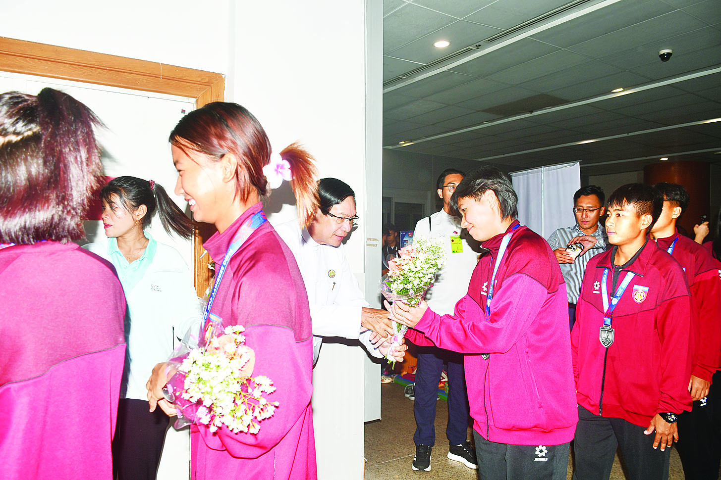 အဆိုပါ မြန်မာ့လက်ရွေးစင် အမျိုးသမီးအသင်း ကိုရန်ကုန်တိုင်းဒေသကြီးဝန်ကြီးချုပ်ဦးစိုးသိန်း၊ တိုင်းဒေသကြီးဝန်ကြီးများ၊ အာရှဘောလုံးအဖွဲ့ချုပ် အကြီးတန်းဒုတိယဥက္ကဋ္ဌနှင့် မြန်မာနိုင်ငံဘောလုံးအဖွဲ့ချုပ် ဥက္ကဋ္ဌဦးဇော်ဇော်၊ ရန်ကုန်တိုင်းဒေသကြီးအားကစားနှင့် ကာယပညာဦးစီးဌာန ညွှန်ကြားရေးမှူးနှင့် တာဝန်ရှိသူများ၊ မြန်မာနိုင်ငံဘောလုံး အဖွဲ့ချုပ်မှ အားကစားသမားများ၊ အားကစားနှင့် ကာယပညာသိပ္ပံ(ရန်ကုန်)မှ သင်တန်းသား သင်တန်းသူများ၊ မိဘပြည်သူများနှင့်တာဝန်ရှိသူများက ရန်ကုန်အပြည်ပြည်ဆိုင်ရာလေဆိပ်၌ ဂုဏ်ပြုကြိုဆိုခဲ့ကြသည်။