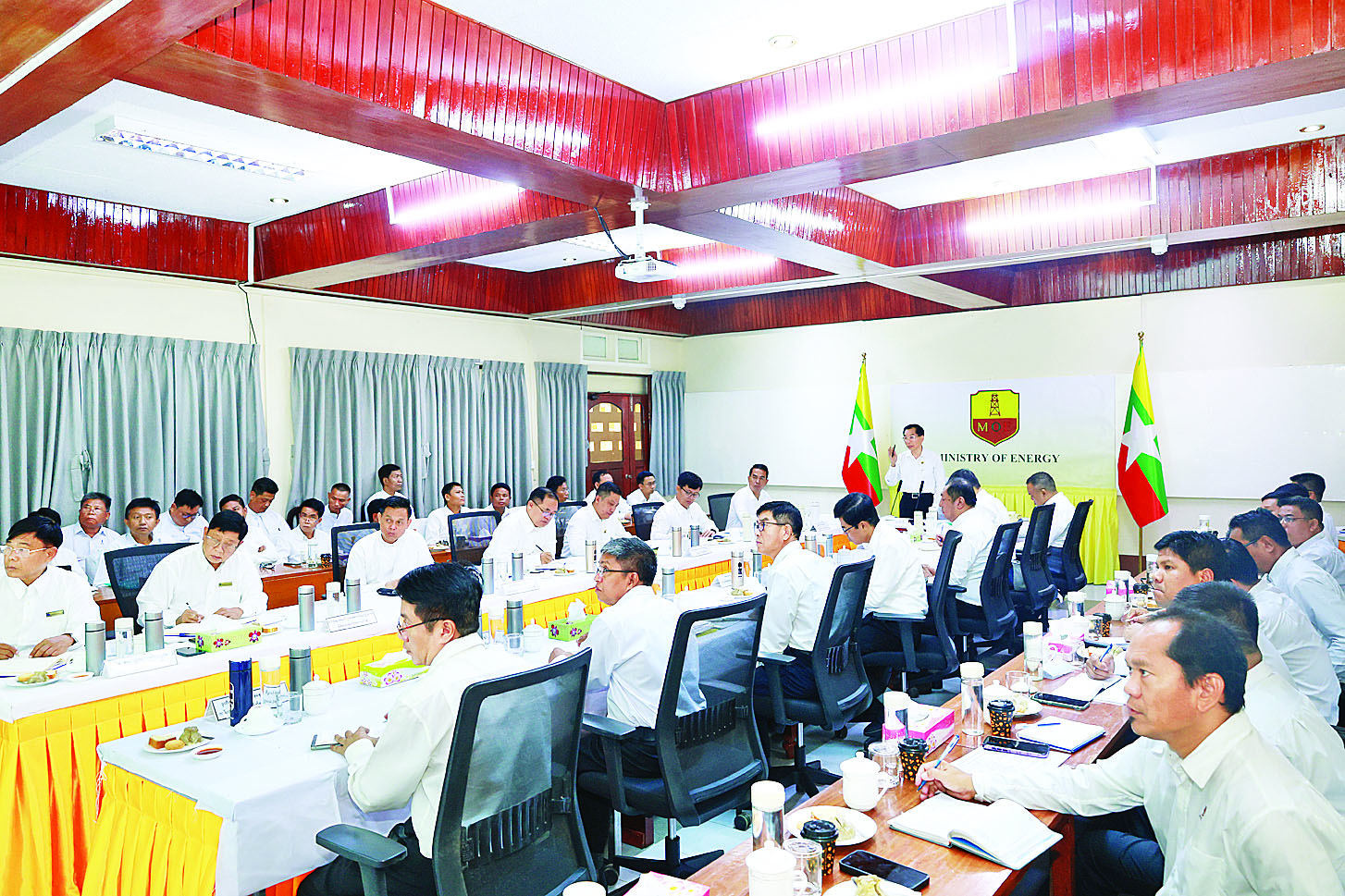 နိုင်ငံ့စီးပွားဖွံ့ဖြိုးတိုးတက်ရေးအတွက် ပြည်တွင်းသဘာဝဓာတ်ငွေ့သုံးစွဲမှုအား အကျိုးရှိထိရောက်စွာ အသုံးပြုနိုင်ရေးညှိနှိုင်းအစည်းအဝေးကို ယနေ့တွင် ရန်ကုန်တိုင်းဒေသကြီးအတွင်းရှိ စွမ်းအင်ဝန်ကြီးဌာန မြန်မာ့ရေနံနှင့် သဘာဝဓာတ်ငွေ့လုပ်ငန်း၊ အောက်မြန်မာပြည်ရုံးခွဲ (စိမ်းလဲ့မေ) ၌ ကျင်းပရာ စွမ်းအင်ဝန်ကြီးဌာန ပြည်ထောင်စုဝန်ကြီး ဦးကိုကိုလွင်၊ ပြည်ထောင်စုဝန်ကြီးရုံး ညွှန်ကြားရေးမှူးချုပ်၊ ဝန်ကြီးဌာနကြီးကြပ်မှုအောက်ရှိ လုပ်ငန်းများမှ တာဝန်ရှိသူများ၊ သက်ဆိုင်ရာ အထွေထွေမန်နေဂျာများ၊ စက်ရုံမှူးများနှင့် တာဝန်ရှိသူများ တက်ရောက်ကြသည်။