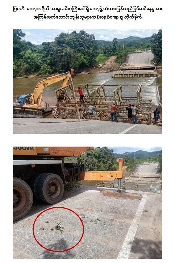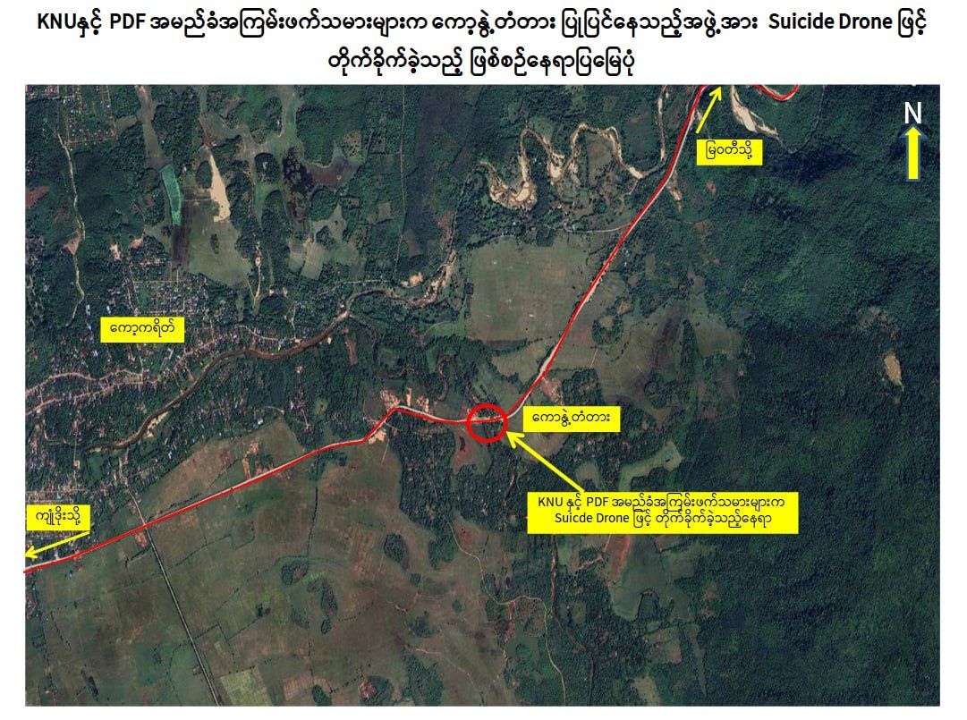 ကော့ကရိတ်-မြဝတီသွား အာရှလမ်းမကြီးပေါ်ရှိ ကော့နွဲ့တံတား ပြုပြင်ရေးအဖွဲ့အား KNU နှင့် PDF အမည်ခံအကြမ်းဖက်သမားများက Suicide Drone များဖြင့် ပစ်ချတိုက်ခိုက်