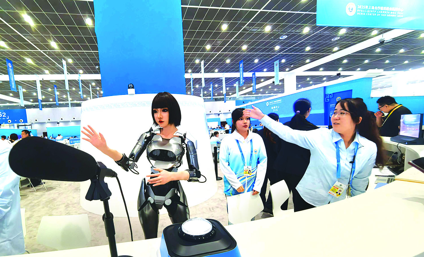 မီဒီယာစင်တာ၌ နည်းပညာမြင့်စက်ရုပ်များကိုပါ ထည့်သွင်းဝန်ဆောင်မှုပေးထားပြီး Xiaohe အမည်ရှိ စက်ရုပ်အမျိုးသမီးက သတင်းထောက်များ၏ သိရှိလိုသည်များကို ရှင်းလင်းဝန်ဆောင်မှုပေးလျက်ရှိသည်။