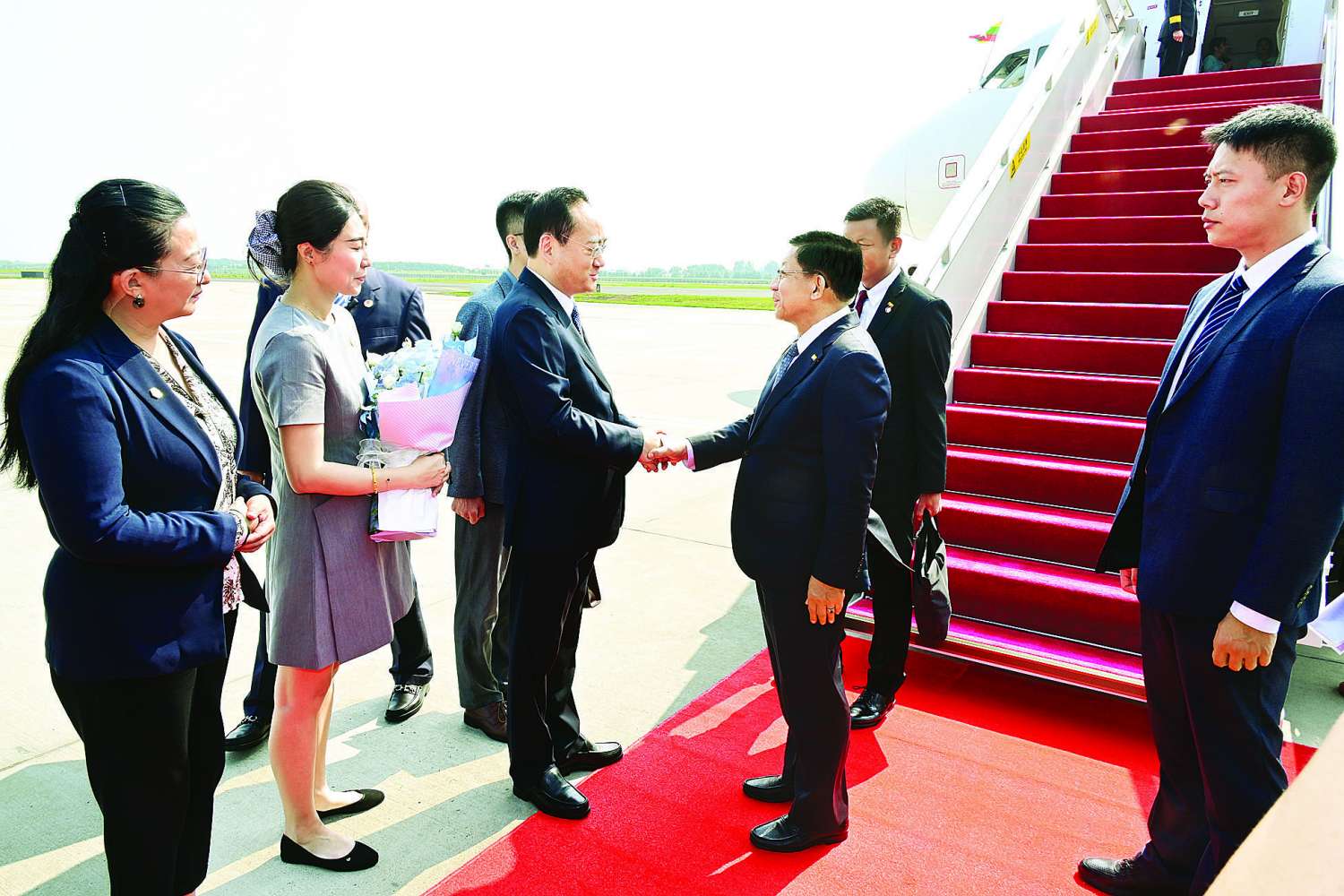 ယင်းနောက် ပြည်ထောင်စုသမ္မတမြန်မာနိုင်ငံတော် ယာယီသမ္မတ နိုင်ငံတော်လုံခြုံရေးနှင့် အေးချမ်းသာယာရေးကော်မရှင်ဥက္ကဋ္ဌ ဗိုလ်ချုပ်မှူးကြီးမင်းအောင်လှိုင် ဦးဆောင်သည့် ကိုယ်စားလှယ်အဖွဲ့သည် ဒေသစံတော်ချိန် နံနက် ၉ နာရီခွဲတွင် ဟာပင်းမြို့၊ Taiping International Airport သို့ရောက်ရှိကြရာ တရုတ်အစိုးရမှ ဒုတိယဝန်ကြီးအဆင့်ရှိသူတစ်ဦးနှင့် တာဝန်ရှိသူများက လေဆိပ်တွင် ကြိုဆိုနှုတ်ဆက်ကြသည်။