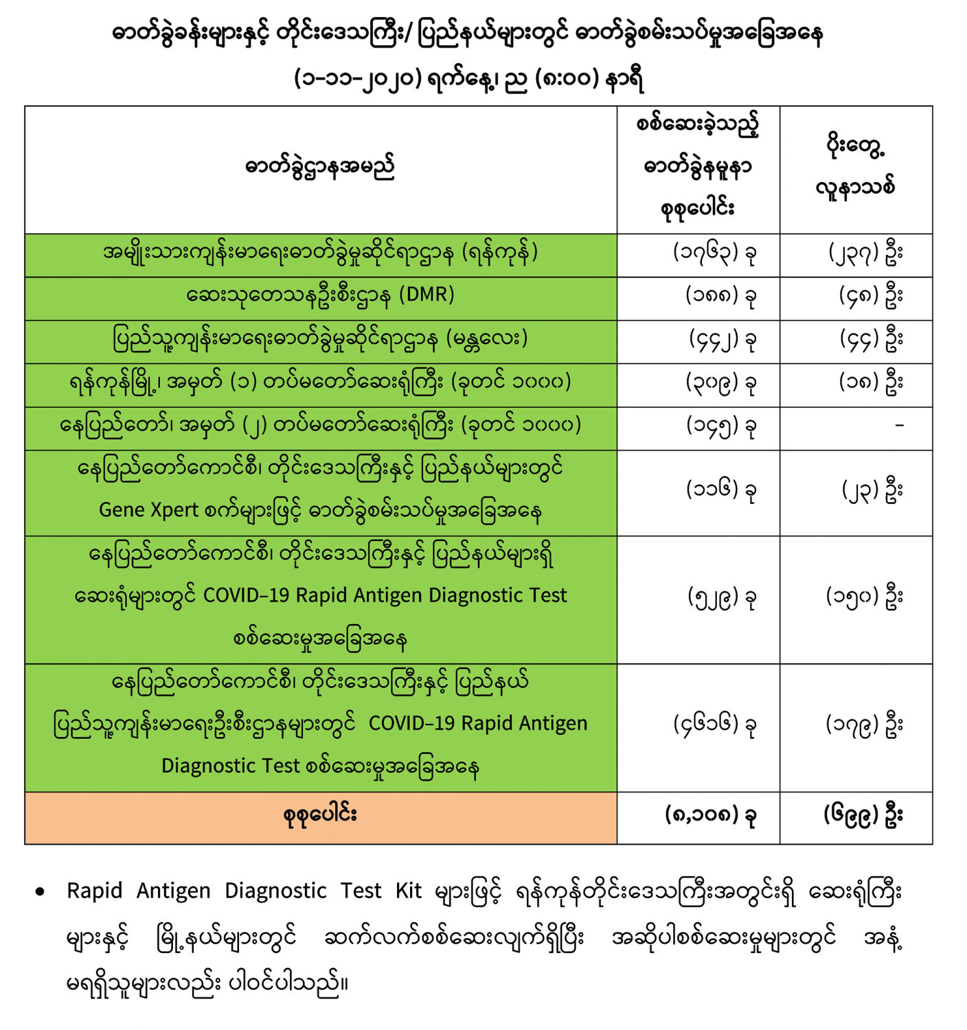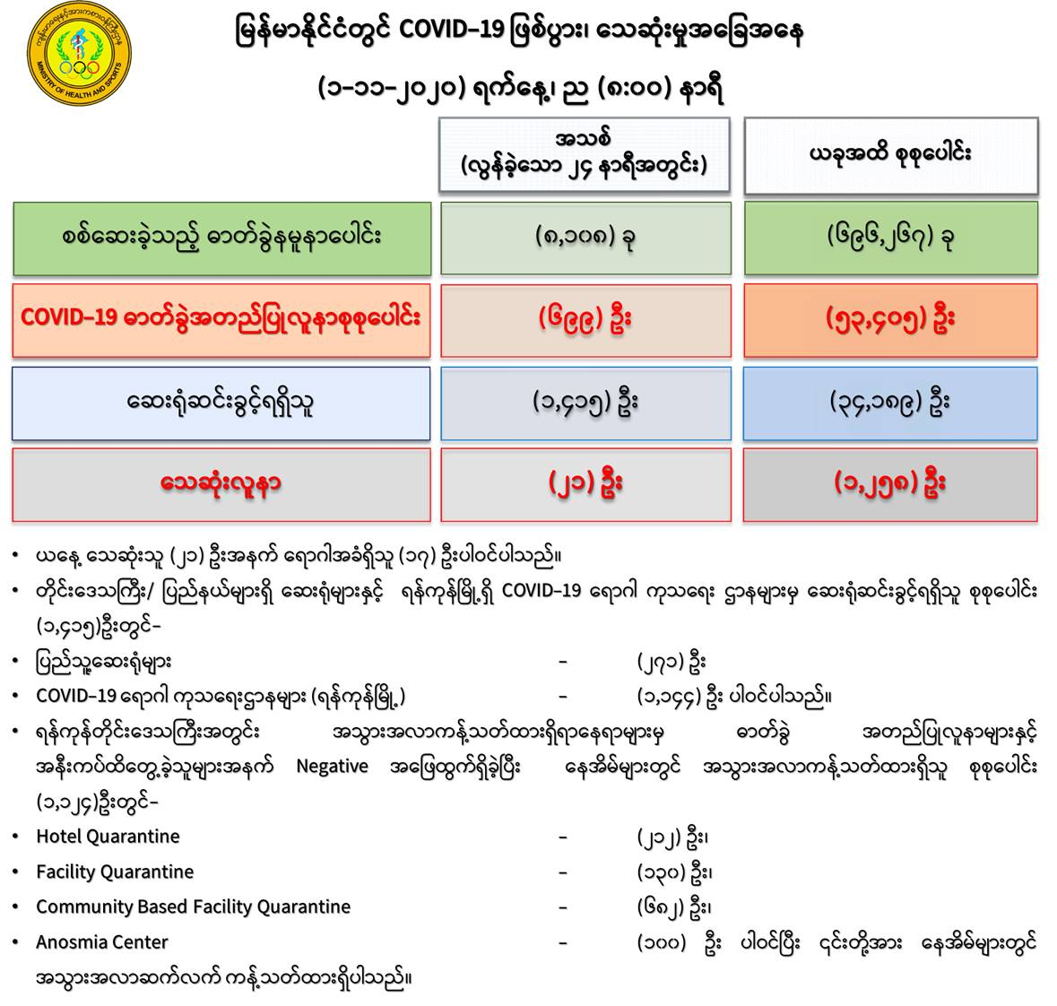 (၃၁-၁၀-၂၀၂၀) ရက်နေ့၊ ည (၈:၀၀) နာရီမှ (၁-၁၁-၂၀၂၀) ရက်နေ့၊ ည (၈:၀၀) နာရီ အတွင်း ဓာတ်ခွဲနမူနာ စုစုပေါင်း (၈,၁၀၈) ခုအား စစ်ဆေးပြီးစီးခဲ့ရာ COVID-19 ရောဂါ ဓာတ်ခွဲ အတည်ပြု လူနာသစ်(၆၉၉)ဦး တွေ့ရှိရပါသည်။
