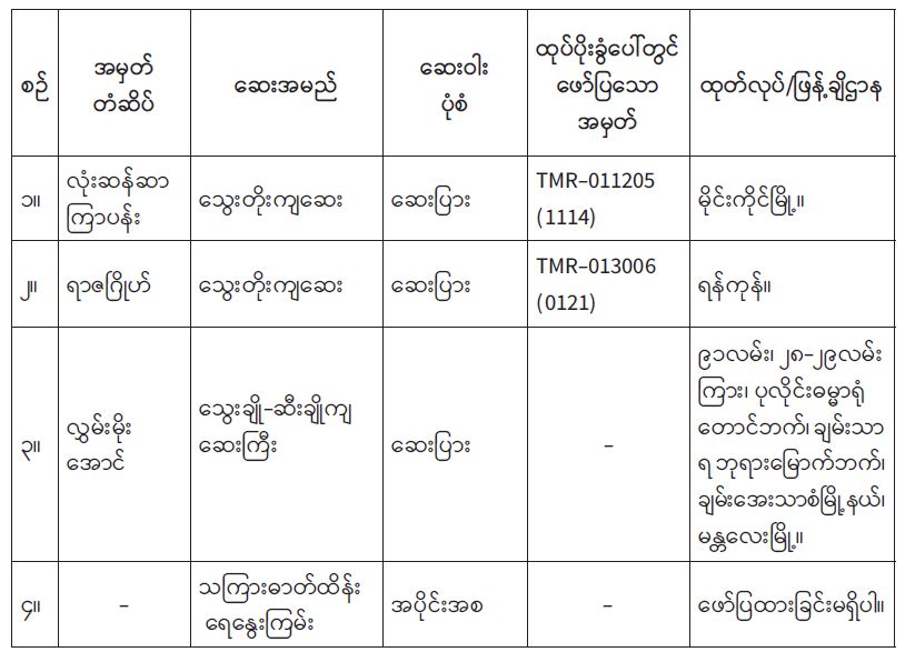 ၂။ ယင်းသို့စစ်ဆေးရာတွင် ဈေးကွက်အတွင်း ရောင်းချလျက်ရှိသော လုံးဆန်ဆာ ကြာပန်းအမှတ် တံဆိပ်သွေးတိုးကျဆေးနှင့် ရာဇဂြိုဟ်အမှတ်တံဆိပ် သွေးတိုးကျဆေးတို့သည် တိုင်းရင်းဆေးဝါးမှတ်ပုံ တင်ရရှိခဲ့သော်လည်း ထုတ်လုပ်ခွင့်လိုင်စင် လျှောက်ထားမှုမရှိခြင်း၊ တိုင်းရင်းဆေးဝါး မှတ်ပုံတင်သက်တမ်းကုန်ဆုံးခြင်း၊ လွှမ်းမိုးအောင်အမှတ်တံဆိပ် သွေးချိုဆီးချိုကျဆေးကြီးနှင့် သကြားဓာတ်ထိန်းရေနွေးကြမ်းတို့သည် တိုင်းရင်းဆေးဝါး မှတ်ပုံတင်ထားခြင်းမရှိခြင်းတို့ကြောင့် ၎င်းတိုင်းရင်း ဆေးဝါး (၄) မျိုးသည် တိုင်းရင်းဆေးဝါးမှတ်ပုံတင် မရှိသောတိုင်းရင်းဆေးဝါးများဖြစ်သဖြင့် ဆေးဝါးစစ်မှန်အစွမ်းထက်မှုကို အာမခံချက်မပေးနိုင်သောကြောင့် အများပြည်သူများသုံးစွဲရန်မသင့်ကြောင်း အသိပေးအပ်ပါသည်။