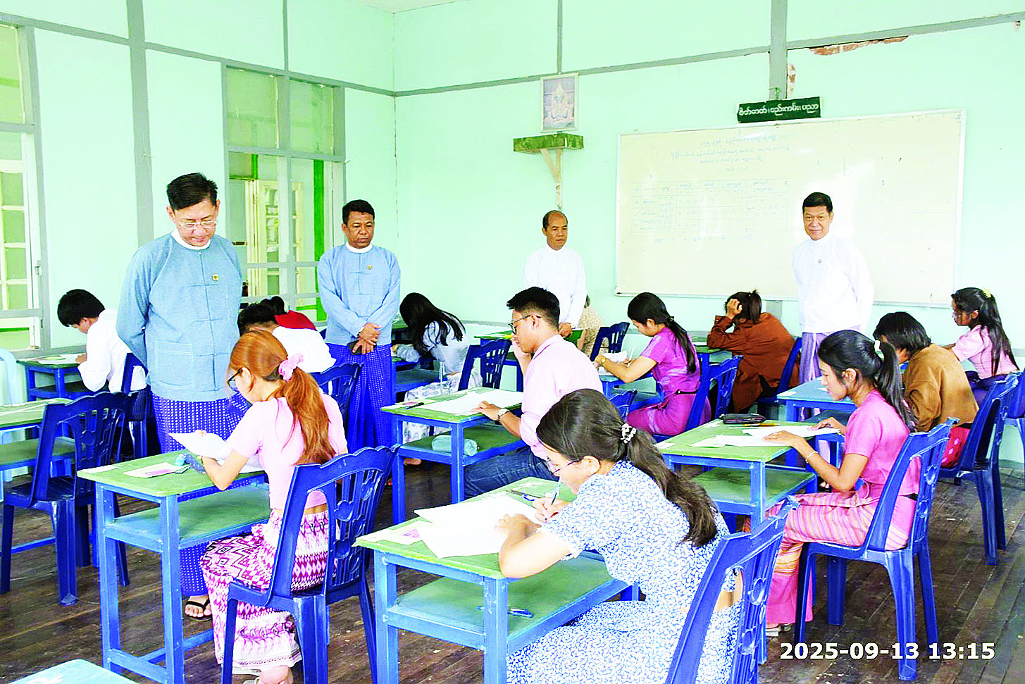 ပြည်ထောင်စုရာထူးဝန်အဖွဲ့၏ ကြော်ငြာစာအမှတ်၊ (၁/၂၀၂၅နှင့် ၂ / ၂၀၂၅) ပါ ဝန်ကြီးဌာနနှင့် အဖွဲ့အစည်း ၁၉ ခုရှိ ပြန်တမ်းဝင်အရာရှိအဆင့် စတင်ခန့်လစ်လပ် ရာထူး ၆၂၉ နေရာ ရွေးချယ်ပေးရန် ရေးဖြေစာမေးပွဲကို နေပြည်တော်၊ ရန်ကုန်မြို့၊ မန္တလေးမြို့၊ မကွေးမြို့နှင့် မော်လမြိုင်မြို့တို့ရှိ စာစစ်ဌာနငါးခု၌ ၂၀၂၅ ခုနှစ် စက်တင်ဘာ ၁၃ ရက်မှ ၁၄ ရက်အထိ တစ်ပြိုင်တည်းကျင်းပလျက်ရှိရာ ပြည်ထောင်စုရာထူးဝန်အဖွဲ့ဥက္ကဋ္ဌ ဦးစိုးမင်းဦးနှင့် တာဝန်ရှိသူများ လှည့်လည်ကြည့်ရှုသည်။