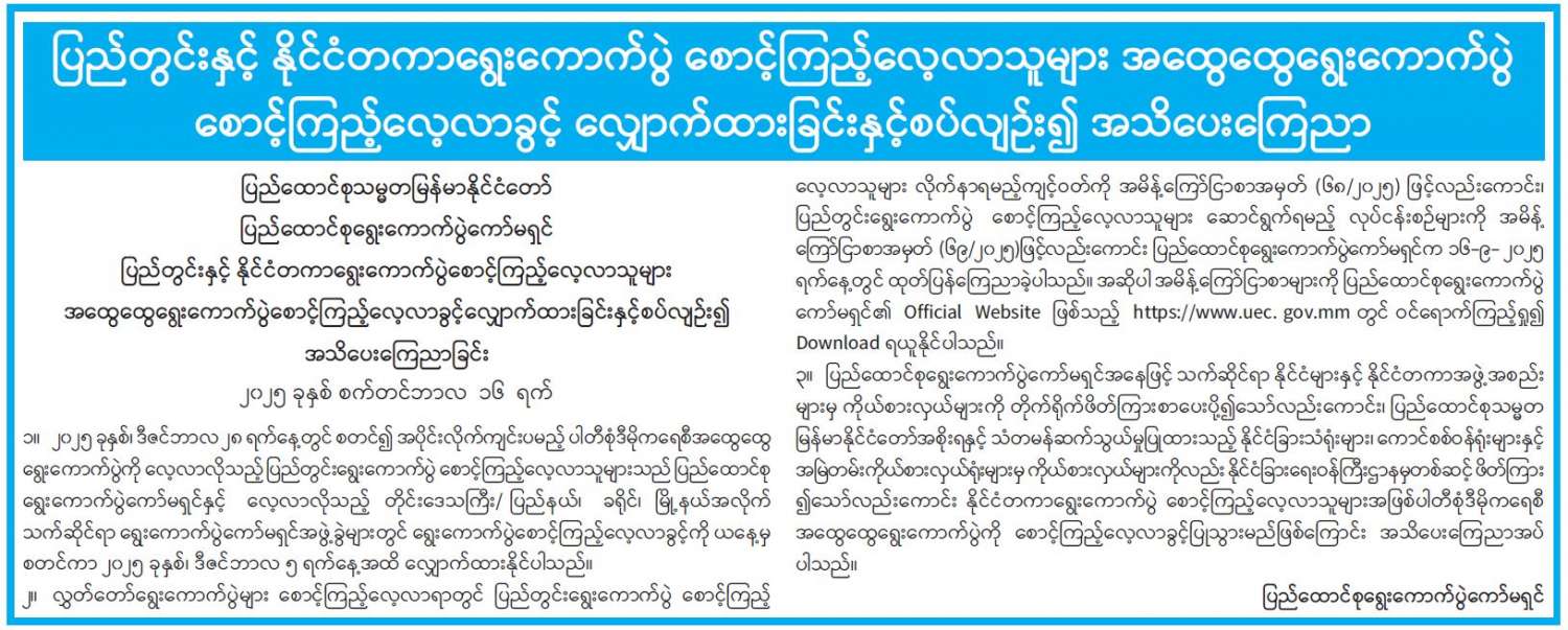 ပြည်တွင်းနှင့် နိုင်ငံတကာရွေးကောက်ပွဲ စောင့်ကြည့်လေ့လာသူများ အထွေထွေရွေးကောက်ပွဲ စောင့်ကြည့်လေ့လာခွင့် လျှောက်ထားခြင်းနှင့်စပ်လျဉ်း၍ အသိပေးကြေညာ 09/17/2025