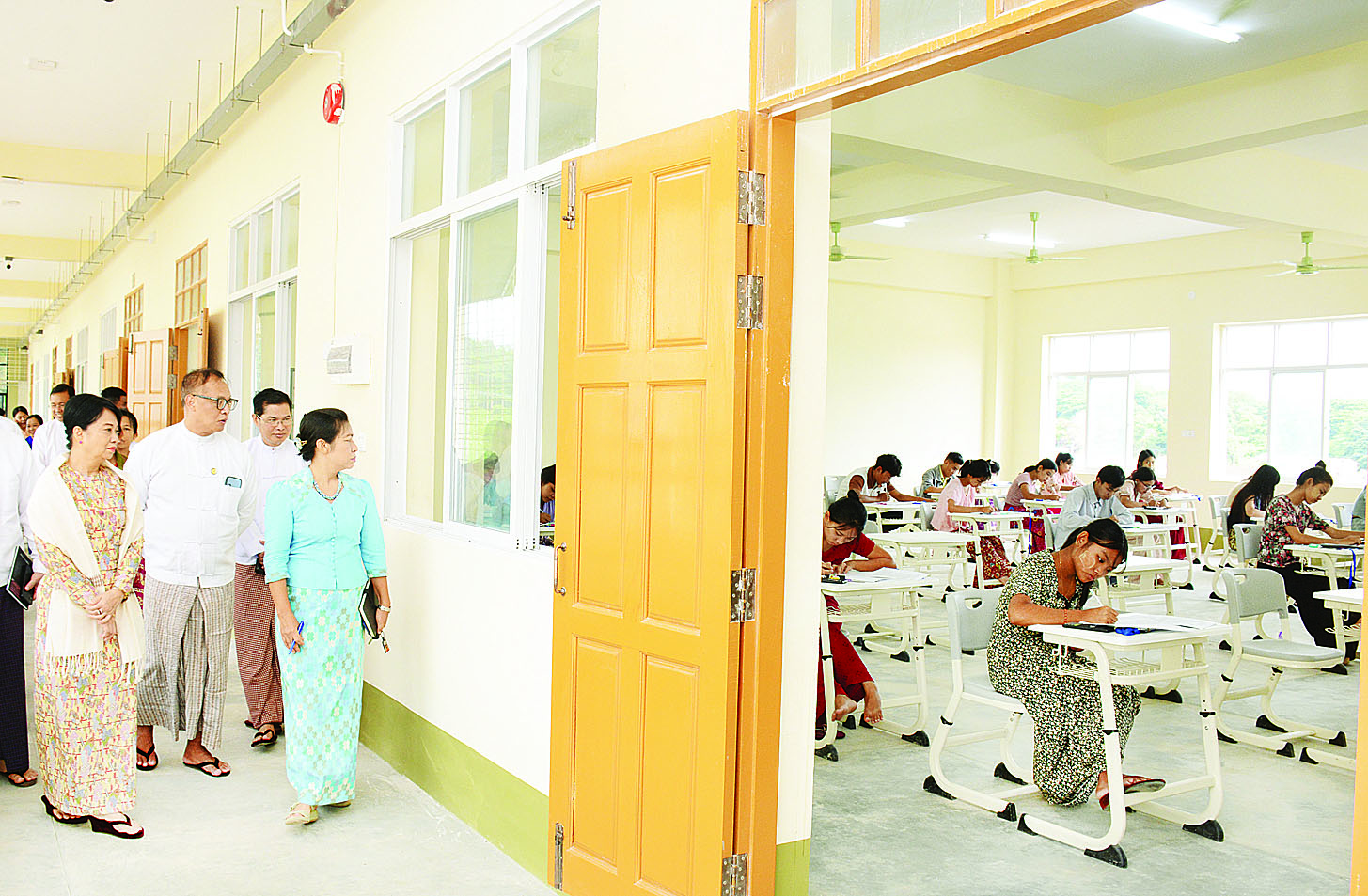 Naypyitaw State Academy ၂၀၂၄-၂၀၂၅ ပညာသင်နှစ် ပထမနှစ်၊ ဒုတိယနှစ်၊ တတိယနှစ်၊ စတုတ္ထနှစ်၊ ပဉ္စမနှစ်(ဥပဒေ)၊ ပထမနှစ်ဂုဏ်ထူးတန်း၊ ဒုတိယနှစ်ဂုဏ်ထူးတန်း၊ တတိယနှစ်ဂုဏ်ထူးတန်း၊ မဟာအရည်အချင်းစစ်သင်တန်းနှင့် မဟာတန်း ပထမနှစ်သင်တန်းများ၏ ဒုတိယစာသင်နှစ်ဝက် စာမေးပွဲတွင် တက္ကသိုလ်ကျောင်းသား ကျောင်းသူများ အေးချမ်းစွာဖြေဆိုနေမှုကို ယနေ့နံနက်ပိုင်းက ပညာရေးဝန်ကြီးဌာန ပြည်ထောင်စုဝန်ကြီး ဒေါက်တာ‌ချောချောစိန်သည် တာဝန်ရှိသူများနှင့်အတူ သွားရောက်ကြည့်ရှုအားပေးသည်။