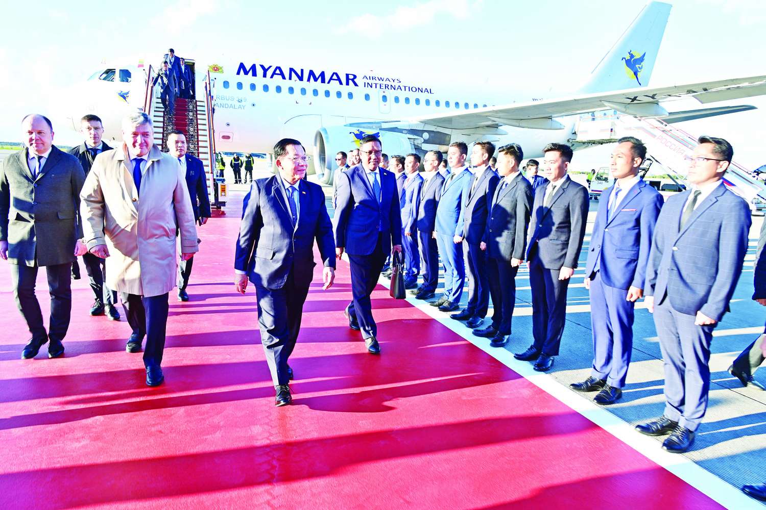 နိုင်ငံတော်ယာယီသမ္မတ နိုင်ငံတော်လုံခြုံရေးနှင့်အေးချမ်းသာယာရေးကော်မရှင်ဥက္ကဋ္ဌ ဦးဆောင်သည့် မြန်မာအဆင့်မြင့်ကိုယ်စားလှယ်အဖွဲ့အား ကော်မရှင် ဒုတိယဥက္ကဋ္ဌ ဒုတိယဗိုလ်ချုပ်မှူးကြီး စိုးဝင်း၊ ကော်မရှင်အဖွဲ့ဝင် နိုင်ငံတော်ဝန်ကြီးချုပ် ဦးညိုစော၊ ကော်မရှင်အဖွဲ့ဝင် အမှုဆောင်ချုပ် ဦးအောင်လင်းဒွေး၊ ကော်မရှင်အဖွဲ့ဝင်များ၊ ပြည်ထောင်စုဝန်ကြီးများ၊ မြန်မာနိုင်ငံဆိုင်ရာ ရုရှားဖက်ဒရေးရှင်းနိုင်ငံ သံအမတ်ကြီး H.E. Mr. Iskander Azizov ၊ ကာကွယ်ရေးဦးစီးချုပ်ရုံးမှ အဆင့်မြင့်တပ်မတော်အရာရှိကြီးများ၊ နေပြည်တော်တိုင်းစစ်ဌာနချုပ် တိုင်းမှူး၊ မြန်မာနိုင်ငံဆိုင်ရာ ရုရှားဖက်ဒရေးရှင်းနိုင်ငံသံရုံး၊ စစ်သံရုံးတို့မှ တာဝန်ရှိသူများက လေဆိပ်၌ ပို့ဆောင်နှုတ်ဆက်ကြသည်။