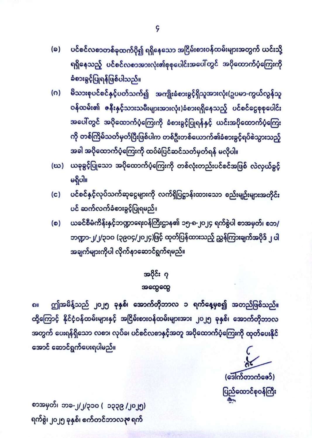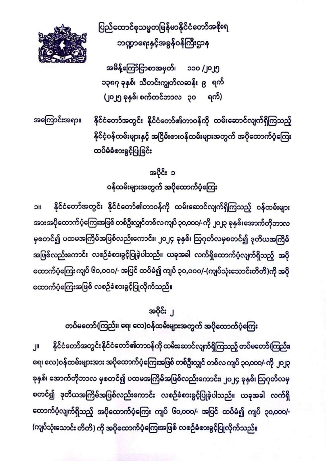 နိုင်ငံတော်အတွင်း နိုင်ငံတော်၏တာဝန်ကို ထမ်းဆောင်လျက်ရှိကြသည့် နိုင်ငံ့ဝန်ထမ်းများနှင့် အငြိမ်းစားဝန်ထမ်းများအတွက် အပိုထောက်ပံ့ကြေး ထပ်မံခံစားခွင့်ပြုခြင်း 09/30/2025