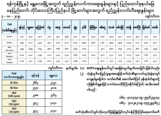 နေပြည်တော်၊ တိုင်းဒေသကြီး/ပြည်နယ် မြို့တော်များအတွက် ရည်ညွှန်းလက်လီစျေးနှုန်းများ