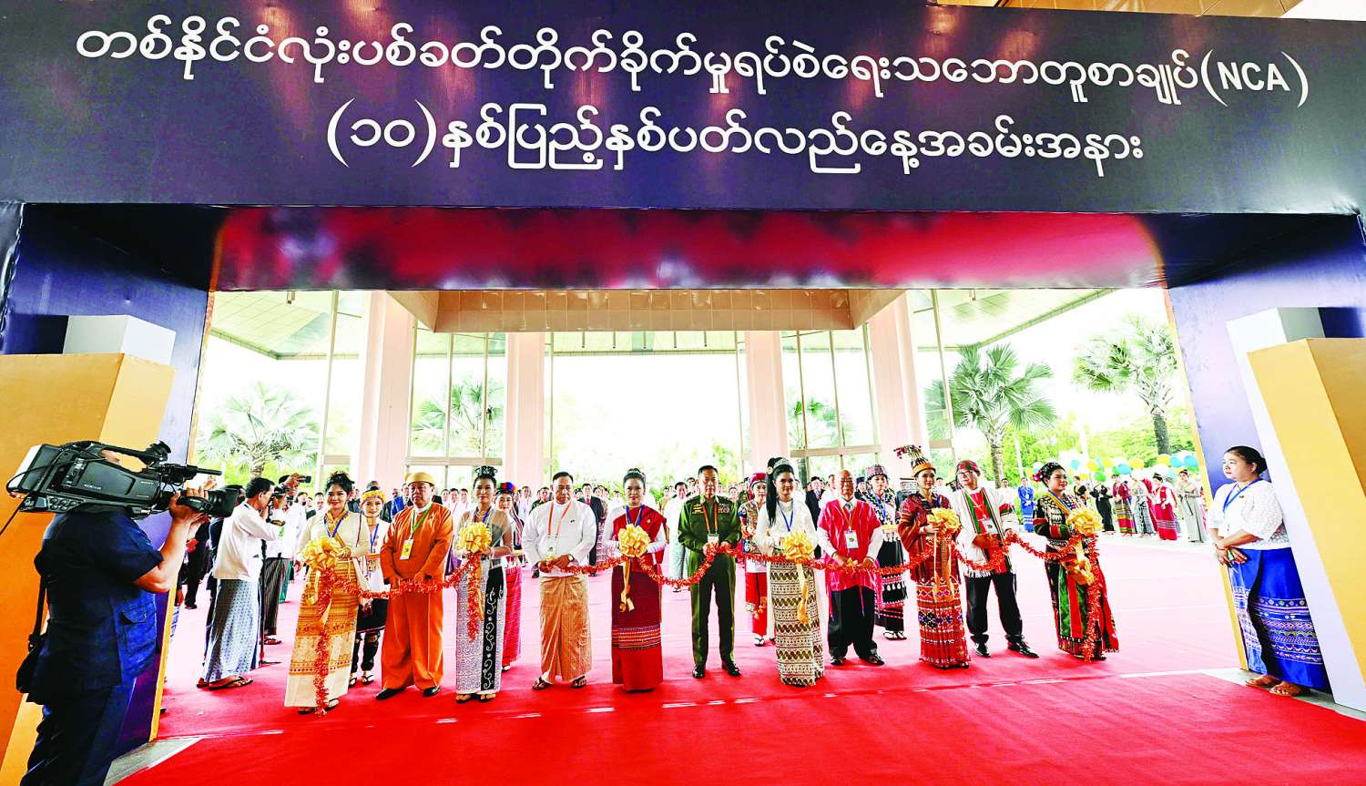 ဦးစွာ နိုင်ငံတော်လုံခြုံရေးနှင့်အေးချမ်းသာယာရေးကော်မရှင် ဒုတိယဥက္ကဋ္ဌ ဒုတိယဗိုလ်ချုပ်မှူးကြီး စိုးဝင်း၊ ကော်မရှင်အဖွဲ့ဝင်၊ ပြည်ထောင်စုဝန်ကြီး အမျိုးသားစည်းလုံးညီညွတ်ရေးနှင့် ငြိမ်းချမ်းရေးဖော်ဆောင်မှုညှိနှိုင်းရေးကော်မတီ ဥက္ကဋ္ဌ ဒုတိယဗိုလ်ချုပ်ကြီးရာပြည့်၊ တိုင်းရင်းသားခေါင်းဆောင်များဖြစ်ကြသည့် စောမူတူးစေဖိုး၊ ဦးဇိုဇမ်နှင့် စိုင်းထွန်းကြည် တို့က တိုင်းရင်းသားများနှင့်အတူ တစ်နိုင်ငံလုံး ပစ်ခတ်တိုက်ခိုက်မှုရပ်စဲရေး သဘောတူစာချုပ်(NCA) (၁၀)နှစ်ပြည့် နှစ်ပတ်လည်နေ့ အခမ်းအနားကို ဖဲကြိုးဖြတ် ဖွင့်လှစ်ပေးကြသည်။