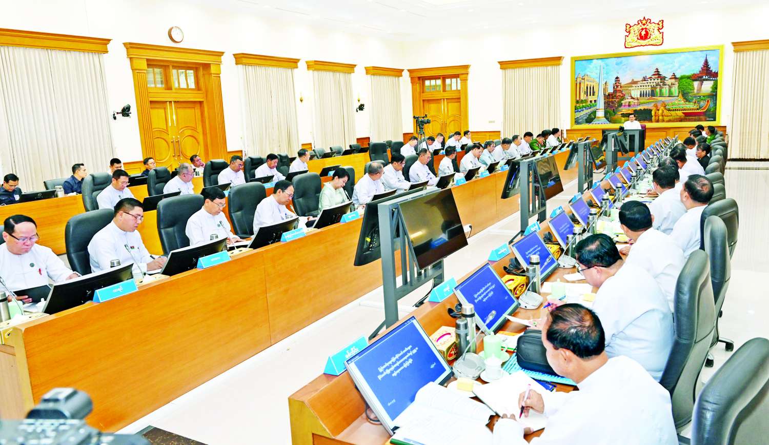 ထို့နောက် ပြည်ထောင်စုဝန်ကြီးများနှင့် တိုင်းဒေသကြီးနှင့်ပြည်နယ်ဝန်ကြီးချုပ်များက ပြည်နယ်နှင့် တိုင်းဒေသများအလိုက် စပါးစိုက်ပျိုးဧကများနှင့် အထွက်နှုန်းမှန်ကန်မှုရှိစေရေးနှင့် ပန်းတိုင်ရည်မှန်းချက်ပြည့်မီရေး ဆောင်ရွက်လျက်ရှိသည့်အခြေအနေများ၊ နိုင်ငံတော်မှ သွင်းအားစုများအပါအဝင် အခြားထောက်ပံ့ပေးလျက်ရှိသည့်အခြေအနေများ၊ ကုန်စည်စီးဆင်းမှု မှန်ကန်မြန်ဆန်ရေးနှင့် ကုန်ဈေးနှုန်းတည်ငြိမ်ရေးဆောင်ရွက်လျက်ရှိသည့် အခြေအနေများ၊ လွတ်လပ်၍တရားမျှတသည့် ပါတီစုံဒီမိုကရေစီအထွေထွေရွေးကောက်ပွဲ အောင်မြင်စေရေးအတွက် မဲစာရင်းများမှန်ကန်မှုရှိစေရေးနှင့် မဲရုံများလျာထားဆောင်ရွက်ထားရှိမှုအခြေအနေများ၊ ခေတ္တပိတ်ထားခဲ့ရသည့် အခြေခံကျောင်းများနှင့်တက္ကသိုလ်များပြန်လည်ဖွင့်လှစ်၍ ပညာသင်ကြားနေမှုအခြေအနေ၊ မူဝါဒများနှင့်အညီ စီမံကိန်းများရာခိုင်နှုန်းအလိုက် အကောင်အထည်ဖော်ဆောင်ရွက်ပြီးစီးမှုအခြေအနေ၊ ငလျင်ကြောင့်ထိခိုက်ပျက်စီးခဲ့မှုများကို ဖယ်ရှားရှင်းလင်းပြီး ပြန်လည်ထူထောင်ရေးလုပ်ငန်းများ ဆောင်ရွက်လျက်ရှိသည့်အခြေအနေများနှင့်ပတ်သက်၍ ရှင်းလင်းတင်ပြသည်။