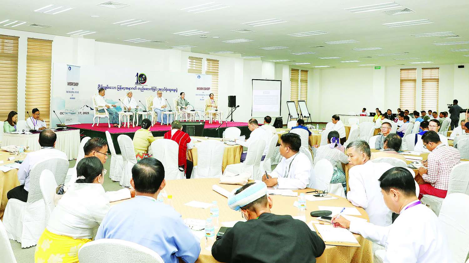 တစ်နိုင်ငံလုံးပစ်ခတ်တိုက်ခိုက်မှုရပ်စဲရေးသဘောတူစာချုပ် (NCA)(၁၀)နှစ်ပြည့်နှစ်ပတ်လည်နေ့အထိမ်းအမှတ်အစီအစဉ်အဖြစ် “ငြိမ်းချမ်းသော မြန်မာ့အနာဂတ်တည်ဆောက်ခြင်း” အလုပ်ရုံဆွေးနွေးပွဲကို နေပြည်တော်ရှိ မြန်မာအပြည်ပြည်ဆိုင်ရာကွန်ဗင်းရှင်းဗဟိုဌာန(၁)ကျောက်စိမ်းခန်းမ၌ ဆက်လက်ကျင်းပသည်။
