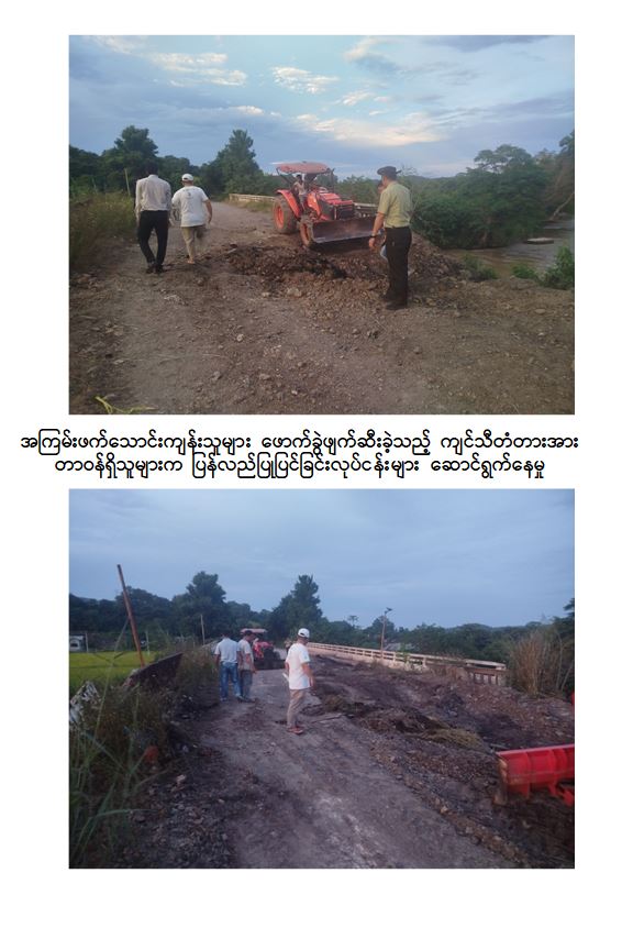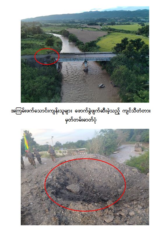 ထိုပြင် အကြမ်းဖက်သောင်းကျန်းသူများသည် တပ်မတော်စစ်ကြောင်းများနှင့် တိုက်ပွဲများဖြစ်ပွားစဉ် ကာလအတွင်း ၎င်းတို့ဆုတ်ခွာထွက်ပြေးရာ လမ်းကြောင်းတစ်လျှောက်ရှိ မြန်မာနိုင်ငံ၏ အထင်ကရအမှတ်အသားနှင့် ကမ္ဘာကျော် ရှေးဟောင်းမီးရထားလမ်းတံတားတစ်စင်းဖြစ်သည့် ဂုတ်ထိပ်တံတား၊ ဂုတ်တွင်းတံတားအပါအဝင် အများပြည်သူ အဓိကသွားလာအသုံးပြုလျက်ရှိသည့် တံတားကြီး/ငယ်များအား ယုတ်မာရိုင်းစိုင်းစွာ မိုင်းထောင်ဖောက်ခွဲဖျက်ဆီးခြင်း၊ လမ်းများပိတ်ဆို့တားဆီးခြင်းများ လုပ်ဆောင်ခဲ့သဖြင့် တပ်မတော်စစ်ကြောင်းများနှင့် ဌာနဆိုင်ရာတာဝန်ရှိသူများက လူအင်အား၊ စက်ယန္တရားများအသုံးပြု၍ ပြန်လည်ပြုပြင်ခြင်းနှင့် ဖယ်ရှားရှင်းလင်းခြင်းလုပ်ငန်းများ ဆောင်ရွက်လျက်ရှိသည်။