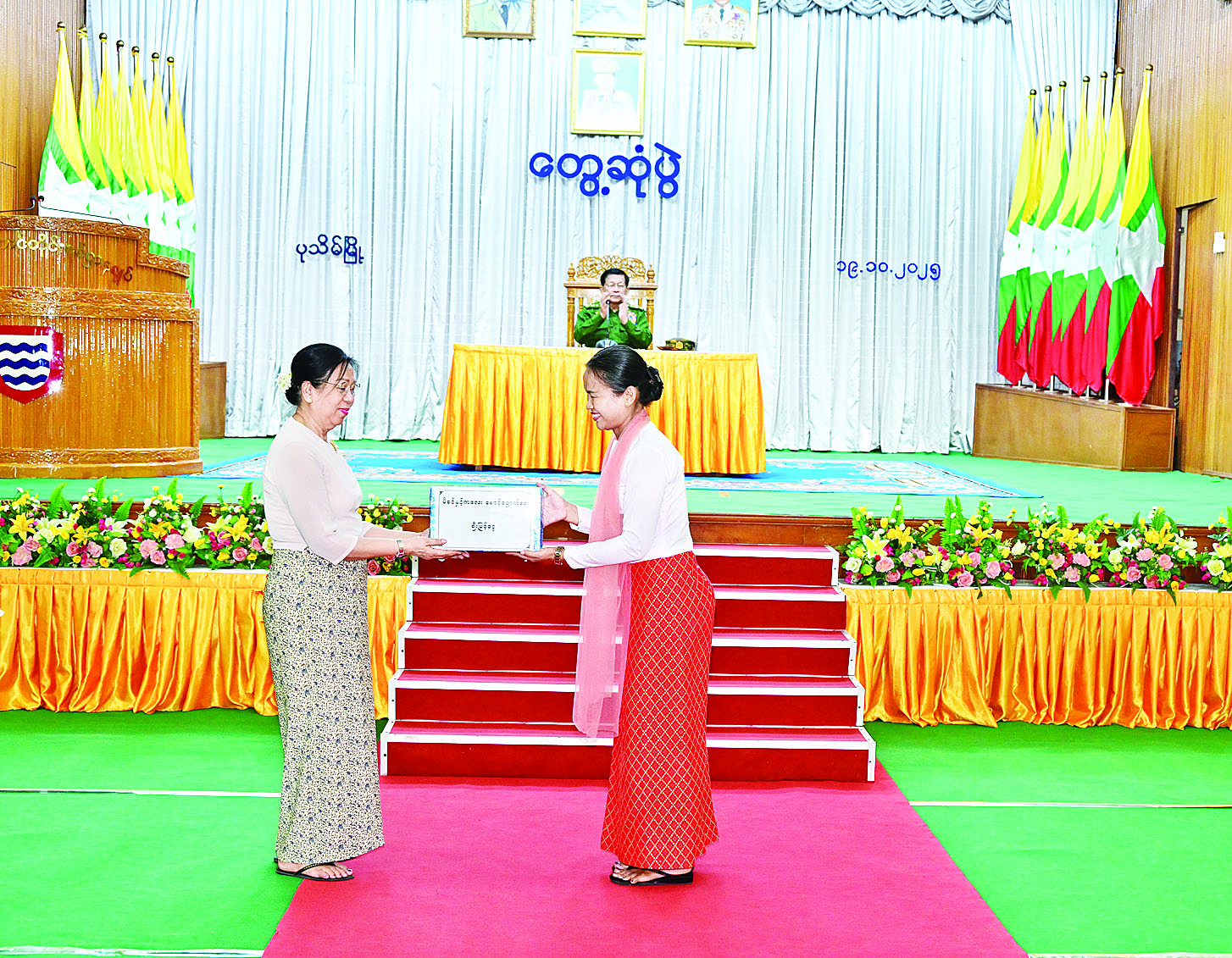 ထို့နောက် နိုင်ငံတော်လုံခြုံရေးနှင့် အေးချမ်းသာယာရေးကော်မရှင်ဥက္ကဋ္ဌ တပ်မတော်ကာကွယ်ရေးဦးစီးချုပ်က တပ်နယ်မှ အရာရှိ၊ စစ်သည်၊ မိသားစုများအတွက် စားသောက်ဖွယ်ရာများကိုပေးအပ်ရာ တိုင်းမှူးကလည်းကောင်း၊ နိုင်ငံတော်လုံခြုံရေးနှင့် အေးချမ်းသာယာရေးကော်မရှင်ဥက္ကဋ္ဌ တပ်မတော်ကာကွယ်ရေးဦးစီးချုပ်၏ဇနီးက တပ်နယ်မိခင်နှင့်ကလေးစောင့်ရှောက်ရေးအသင်းအတွက် ချီးမြှင့်ငွေများကို ပေးအပ်ရာတိုင်းမှူး၏ ဇနီးကလည်းကောင်း အသီးသီးလက်ခံရယူကြသည်။