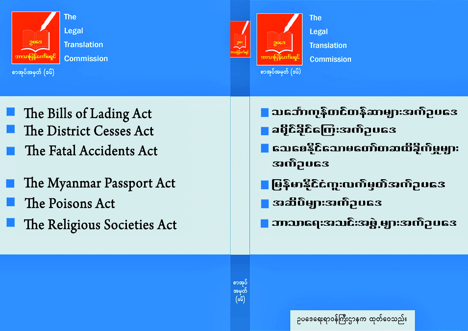 ဥပဒေရေးရာဝန်ကြီးဌာနသည် ဥပဒေဘာသာပြန်ကော်မရှင်က မြန်မာဘာသာသို့ ပြန်ဆိုပြီးသည့် ဥပဒေများကို စာအုပ်ထုတ်ဝေလျက်ရှိရာ ဘာသာပြန်စာအုပ် အမှတ်(၁၆)ကိုထုတ်ဝေပြီး ဖြစ်သည်။