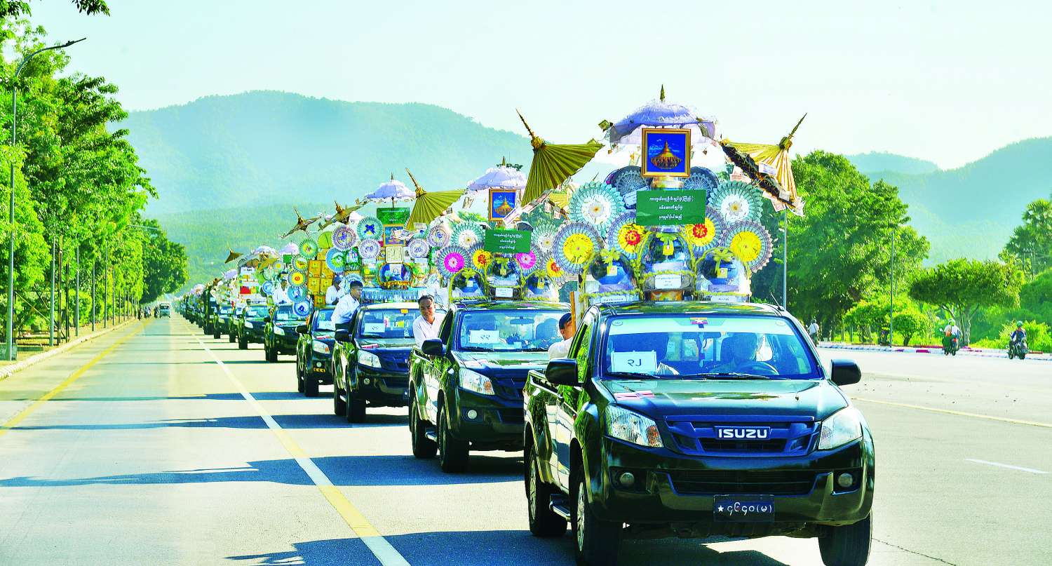 ကာကွယ်ရေးဦးစီးချုပ်ရုံး (ကြည်း၊ ရေ၊ လေ) မိသားစုများ၏ ၂၀၂၅ ခုနှစ် မိသားစု မဟာဘုံကထိန်အလှူတော်အဖြစ် လှူဒါန်းထားသည့် ပဒေသာပင်များအား အောက်တိုဘာ ၂၇ ရက်တွင် ကာကွယ်ရေးဦးစီးချုပ်ရုံး(ကြည်း)ဝန်းအတွင်းရှိ အနော်ရထာခန်းမမှ ဥပ္ပါတသန္တိစေတီတော်မြတ်ကြီးသို့ မော်တော်ယာဉ်များဖြင့် လှည့်လည်ခဲ့သည်။
