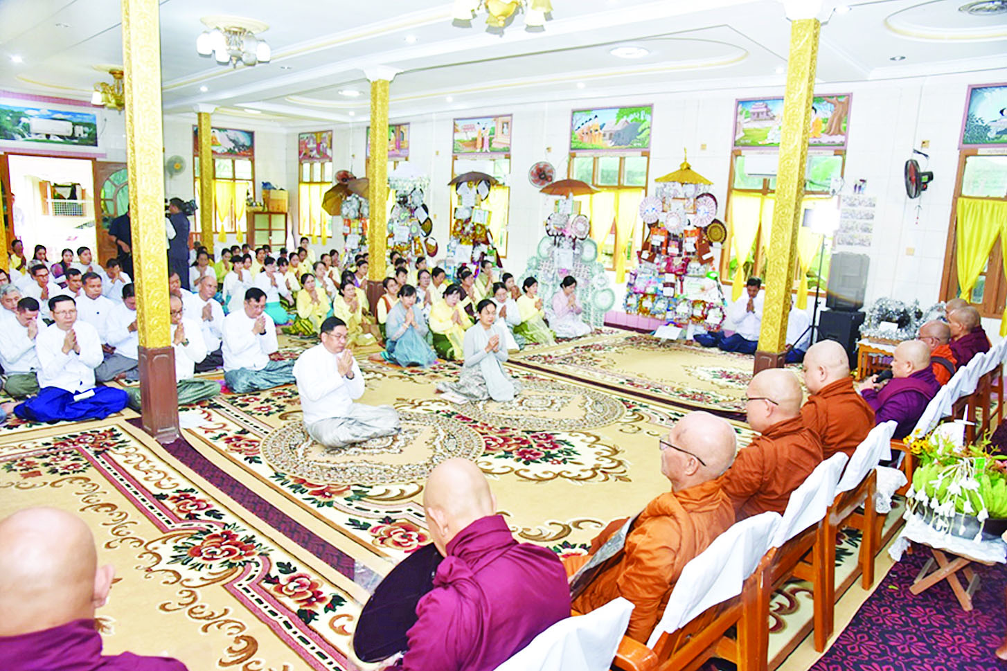 အခမ်းအနားသို့ ပျဉ်းမနားမြို့မစိုးရိမ်ကျောင်းတိုက် ဆရာတော်ဘဒ္ဒန္တရေဝတအမှူးပြုသည့် ပင့်သံဃာတော်ဆရာတော်ကြီးများ ကြွရောက်ချီးမြှင့်တော်မူကြပြီး အခမ်းအနားကို “နမော တဿ” သုံးကြိမ်ရွတ်ဆိုဘုရား ကန်တော့ဖွင့်လှစ်၍ ဧည့်ပရိသတ်အပေါင်းတို့သည် မစိုးရိမ်ကျောင်းတိုက်ဆရာတော် ဘဒ္ဒန္တရေဝတထံမှ ငါးပါးသီလခံယူဆောက်တည်ကာ သံဃာတော်အရှင်သူမြတ်များ ရွတ်ပွားသရဇ္ဈာယ်တော်မူသော ပရိတ်တရားတော်များကို နာယူကြသည်။