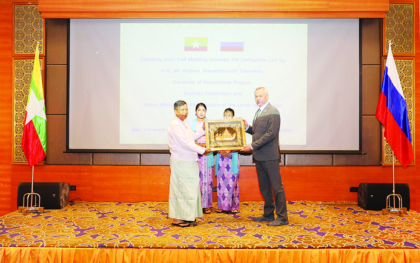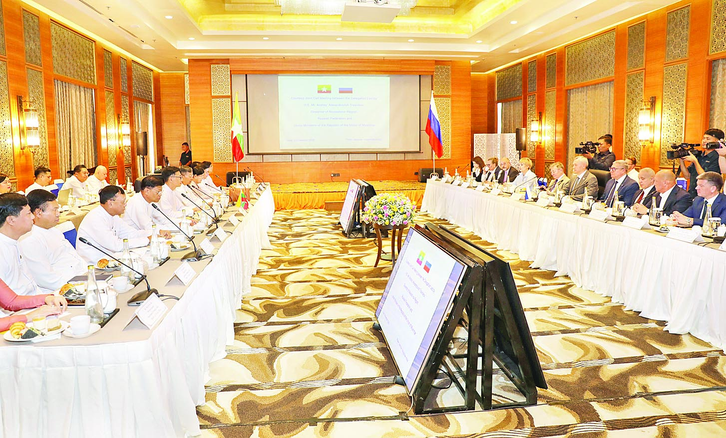 ပြည်ထောင်စုဝန်ကြီးများနှင့် ရုရှားဖက်ဒရေးရှင်းနိုင်ငံ နိုဗိုစီဗစ်ဒေသအုပ်ချုပ်ရေးမှူး H.E.Mr. Andrey Travnikov ဦးဆောင်သော ကိုယ်စားလှယ်အဖွဲ့တို့ တွေ့ဆုံဆွေးနွေးပွဲကို ယနေ့မွန်းလွဲပိုင်းတွင် နေပြည်တော်ရှိ Jasmine Naypyitaw Hotel ၌ ကျင်းပသည်။
