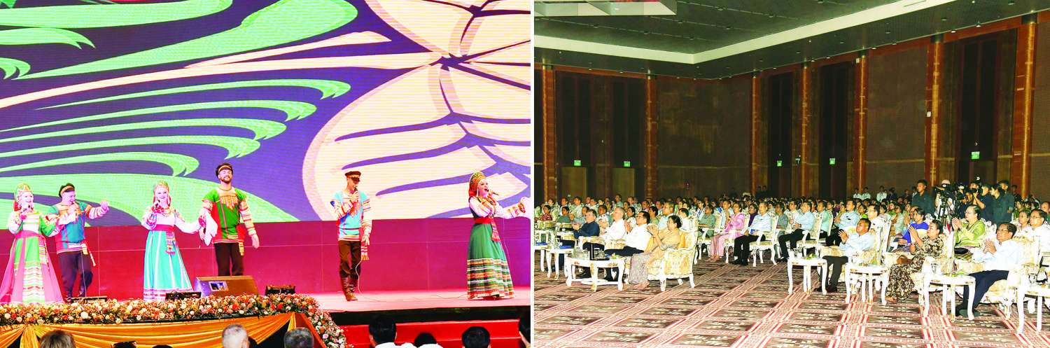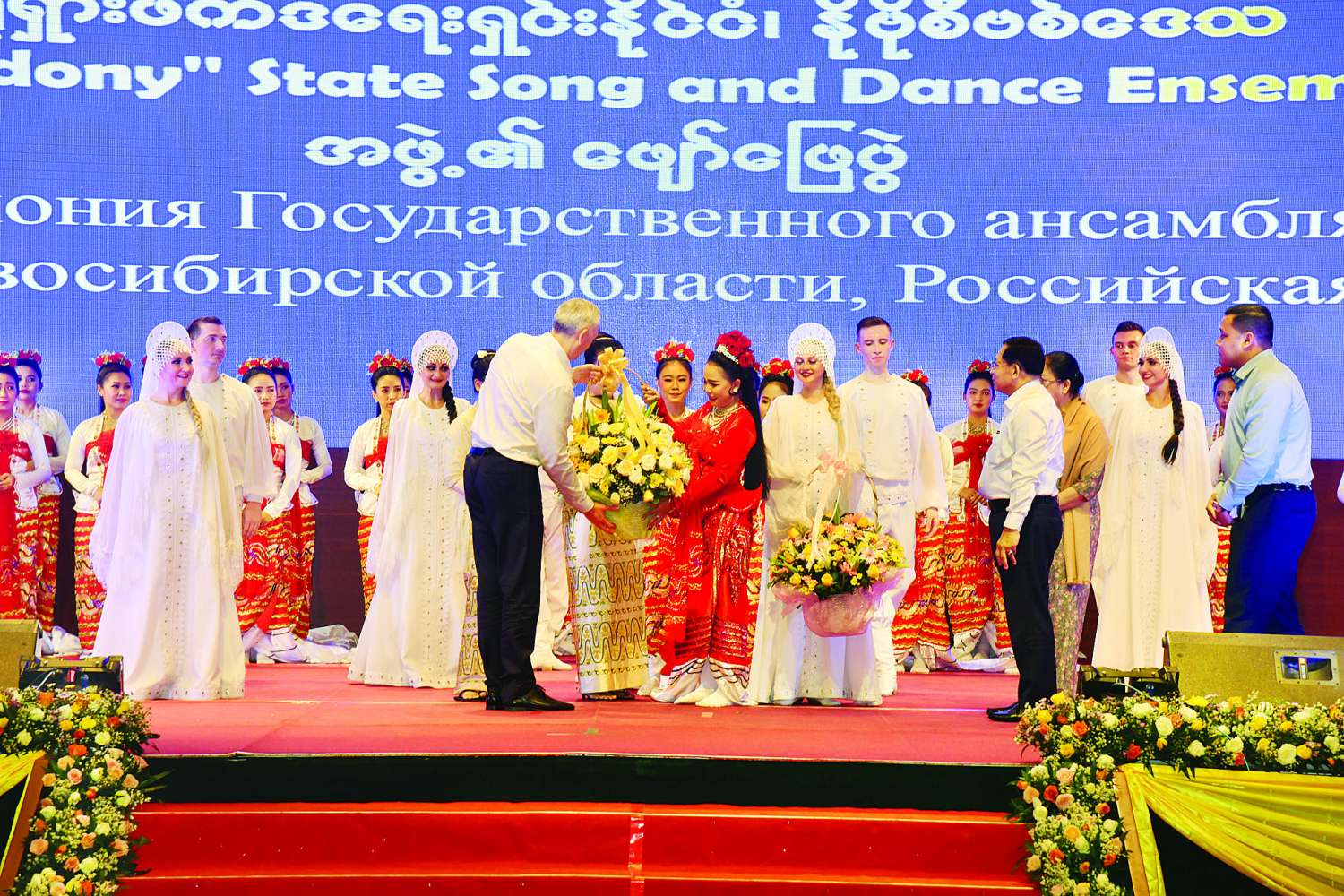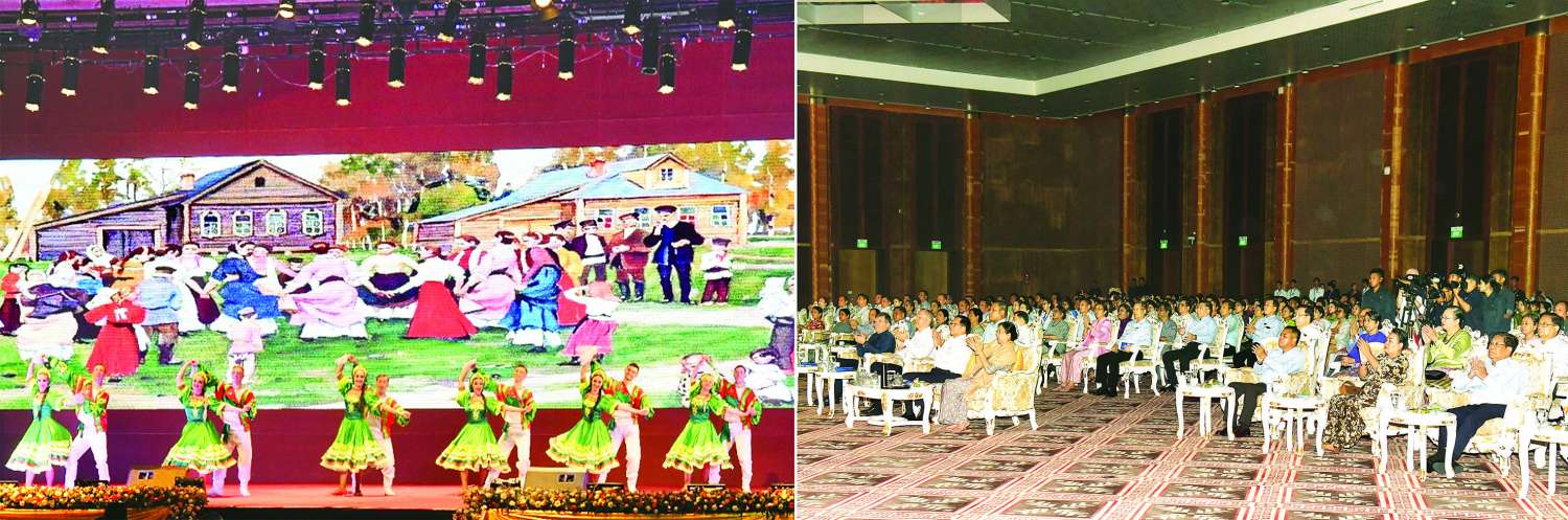 ရုရှားဖက်ဒရေးရှင်းနိုင်ငံ နိုဗိုစီဗစ်ဒေသမှ နိုဗိုစီဗစ် “Chaldony” State Song and Dance Ensemble အဖွဲ့မှ “မဟာရုရှားနှင့် ဆိုက်ဘေးရီးယား” အမည်ရသည့် ပဒေသာကပွဲကို ယနေ့မွန်းလွဲပိုင်းတွင် နေပြည်တော်ရှိ မြန်မာအပြည်ပြည်ဆိုင်ရာကွန်ဗင်းရှင်းဗဟိုဌာန (၁) (MICC-1) ၌ ကျင်းပပြုလုပ်ရာ ပြည်ထောင်စုသမ္မတမြန်မာနိုင်ငံတော်ယာယီသမ္မတ နိုင်ငံတော်လုံခြုံရေးနှင့်အေးချမ်းသာယာရေးကော်မရှင်ဥက္ကဋ္ဌ ဗိုလ်ချုပ်မှူးကြီး မင်းအောင်လှိုင် တက်ရောက်ကြည့်ရှုအားပေးသည်။