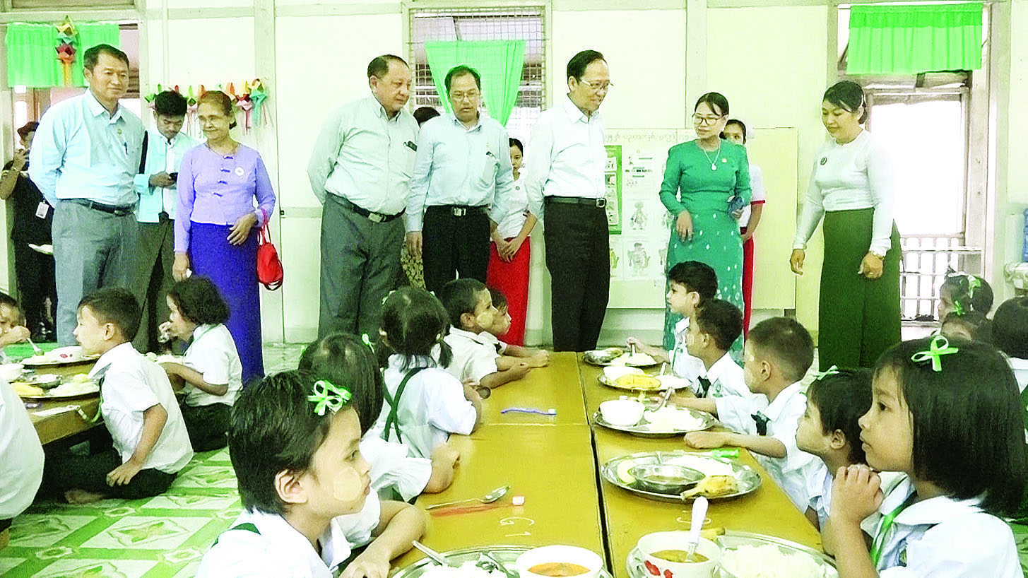ထိုသို့ဆောင်ရွက်လျက်ရှိရာ ကျန်းမာရေးဝန်ကြီးဌာန ပြည်ထောင်စုဝန်ကြီးသည် ယနေ့နံနက်ပိုင်းတွင် ကျောင်းတွင်း အာဟာရကျွေးမွေးခြင်း ဆောင်ရွက်လျက်ရှိသည့် လှိုင်မြို့နယ်ရှိ အ.မ.က (၇) လှိုင်တွင် တက်ရောက်နေသော KG ကျောင်းသား ကျောင်းသူများအား အာဟာရကျွေးမွေးနေခြင်းလုပ်ငန်း‌ဆောင်ရွက်ချက်များကို အားပေးကြည့်ရှုပြီး ကျောင်းတွင်း အာဟာရကျွေးမွေးခြင်းကြောင့် ကျောင်းသား ကျောင်းသူများ ကျန်းမာသန်စွမ်းပြီး အာဟာရ ပြည့်ဝစေနိုင်ကြောင်း၊ ကျန်းမာရေးနှင့်ညီညွတ်သော အမူအကျင့်များ ရရှိစေနိုင်ကြောင်း၊ ကျောင်းသား ကျောင်းသူများမှတစ်ဆင့် မိဘဆွေမျိုးများ၊ ပတ်ဝန်းကျင်ရှိ ပြည်သူလူထုပါ ကျန်းမာရေးနှင့်ညီညွတ်သော စားသောက်မှုပုံစံအလေ့အကျင့်ကောင်းများရရှိနိုင်သည့် အကျိုးကျေးဇူးများ ရရှိနိုင်ကြောင်း မှာကြားသည်။