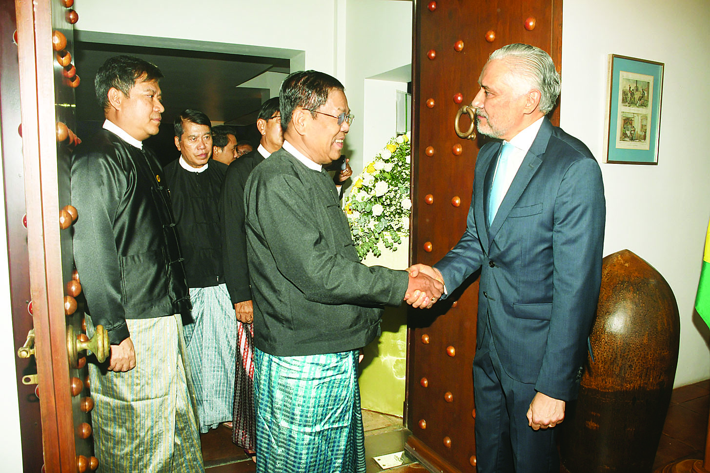 ဦးစွာ မြန်မာနိုင်ငံဆိုင်ရာ ဘရာဇီးလ်နိုင်ငံသံအမတ်ကြီး HE Mr. Gustavo Rocha de Meneses နှင့် တာဝန်ရှိသူများက ဧည့်ခံပွဲအခမ်းအနားသို့ တက်ရောက်လာသော ပြည်ထောင်စုဝန်ကြီး ဦးသန်းဆွေ၊ ရန်ကုန်တိုင်းဒေသ ကြီးဝန်ကြီးချုပ်နှင့် ဧည့်သည်တော်များကို ရင်းရင်းနှီးနှီး ကြိုဆိုနှုတ်ဆက်သည်။