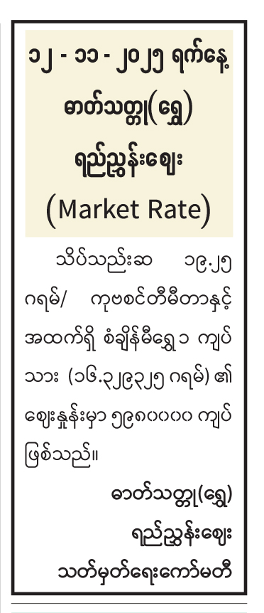 ၁၂ - ၁၁ - ၂ဝ၂၅ ရက်နေ့ ဓာတ်သတ္တု(ရွှေ) ရည်ညွှန်းဈေး (Market Rate)