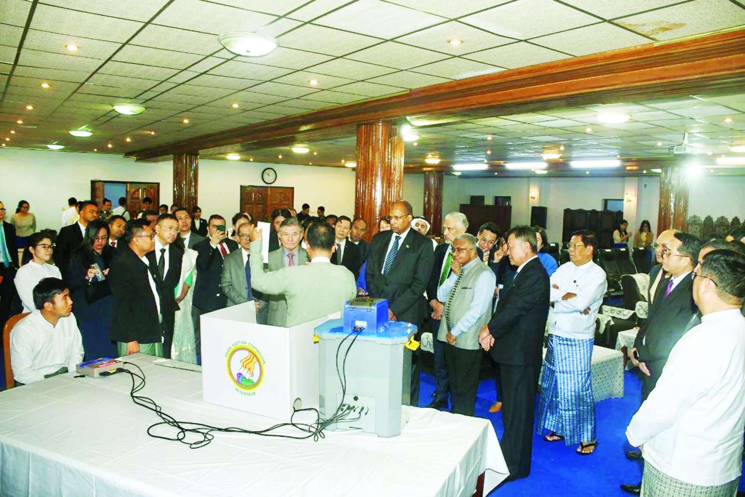 ဆက်လက်၍ ပြည်ထောင်စုရွေးကောက်ပွဲကော်မရှင်မှ တာဝန်ရှိသူများက အီလက်ထရောနစ်မဲပေးစက်အသုံးပြု၍ မဲပေးပုံနည်းစနစ်အကြောင်း ရှင်းလင်းသရုပ်ပြရာ တက်ရောက်လာသည့် သံတမန်များက Electronic Voting Machine ကို လက်တွေ့စမ်းသပ်အသုံးပြုခြင်း၊ သိရှိလိုသည်များအား မေးမြန်းဆွေးနွေးခြင်းတို့ ဆောင်ရွက်ကြသည်။