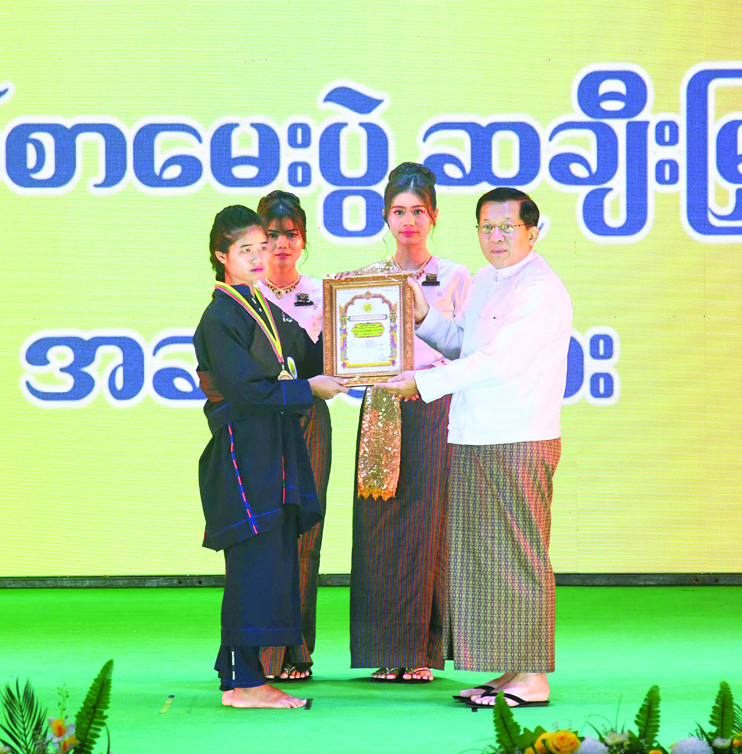 ထို့နောက် နိုင်ငံတော်ယာယီသမ္မတ နိုင်ငံတော်လုံခြုံရေးနှင့်အေးချမ်းသာယာရေးကော်မရှင်ဥက္ကဋ္ဌက ဗုဒ္ဓဘာသာကလျာဏယုဝအသင်းကြီး(YMBA)၏ (၇၅)ကြိမ် မြောက်စိန်ရတု (၃၈)ဖြာ မင်္ဂလာတရားတော်နှင့် ဗုဒ္ဓဝင်စာမေးပွဲတွင် မြန်မာဘာသာ(အကြီးတန်း)၊ ပအိုဝ်းဘာသာ(အကြီးတန်း)နှင့် မွန်ဘာသာ(အငယ်တန်း)တို့တွင် ပထမဆုရရှိခဲ့ကြသူများအား ဆုများပေးအပ်ချီးမြှင့်သည်။