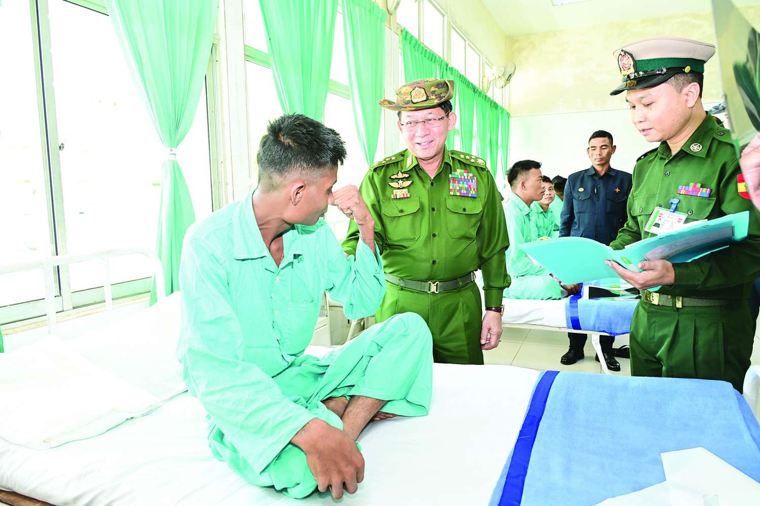 ယင်းနောက် နိုင်ငံတော်လုံခြုံရေးနှင့် အေးချမ်းသာယာရေးကော်မရှင်ဥက္ကဋ္ဌ တပ်မတော်ကာကွယ်ရေးဦးစီးချုပ်သည် မော်လမြိုင်တပ်နယ်ရှိ နယ်မြေခံတပ်မတော်ဆေးရုံတွင် တက်ရောက်ကုသမှုခံယူလျက်ရှိသည့် နိုင်ငံတော်ကာကွယ်ရေးနှင့် လုံခြုံရေးတာဝန်များ ထမ်းဆောင်စဉ် ထိခိုက်ဒဏ်ရာရရှိခဲ့သော အရာရှိ၊ စစ်သည်များအား ထိခိုက်ဒဏ်ရာရရှိခဲ့မှု အခြေအနေများ၊ ရောဂါကုသပျောက်ကင်းမှုအခြေအနေများကို တစ်ဦးချင်းလိုက်လံတွေ့ဆုံ၍ ရင်းနှီးနွေးထွေးစွာမေးမြန်းပြီး အားပေးစကားပြောကြားကာ အရာရှိ၊ စစ်သည်များ၏ တင်ပြချက်များအပေါ် လိုအပ်သည်များ ဖြည့်ဆည်းဆောင်ရွက်ပေးသည်။