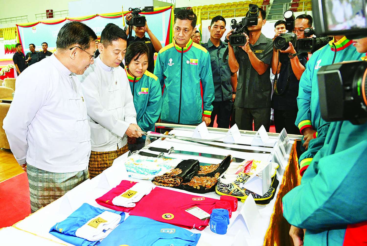 ယင်းနောက် နိုင်ငံတော်ယာယီသမ္မတ နိုင်ငံတော်လုံခြုံရေးနှင့် အေးချမ်းသာယာရေးကော်မရှင်ဥက္ကဋ္ဌက (၃၃)ကြိမ်မြောက် အရှေ့တောင်အာရှအားကစားပြိုင်ပွဲသို့ ဝင်ရောက်ယှဉ်ပြိုင်မည့်အားကစားအဖွဲ့များအား လိုက်လံနှုတ်ဆက်အားပေးစကားပြောကြားပြီး အားကစားအဖွဲ့များအသုံးပြုမည့် အားကစားနည်းများအလိုက် အသုံးအဆောင်ပစ္စည်းများအား ပြခန်းတစ်ခုချင်းစီအလိုက် လိုက်လံကြည့်ရှုစစ်ဆေးကာ တာဝန်ရှိသူများ၏ တင်ပြချက်များအပေါ် လိုအပ်သည်များလမ်းညွှန်မှာကြား ဖြည့်ဆည်းဆောင်ရွက်ပေးခဲ့ကြောင်း သတင်းရရှိသည်။