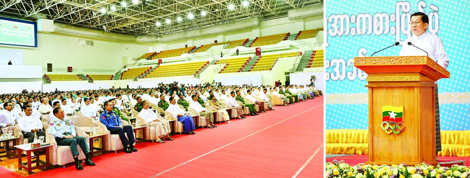 (၃၃)ကြိမ်မြောက် အရှေ့တောင်အာရှအားကစားပြိုင်ပွဲသို့ ဝင်ရောက်ယှဉ်ပြိုင်မည့် မြန်မာအားကစားအဖွဲ့အား အောင်နိုင်ရေးအလံအပ်နှင်းပွဲအခမ်းအနားကျင်းပ ပြည်ထောင်စုသမ္မတမြန်မာနိုင်ငံတော် ယာယီသမ္မတ နိုင်ငံတော်လုံခြုံရေးနှင့် အေးချမ်းသာယာရေးကော်မရှင် ဥက္ကဋ္ဌ ဗိုလ်ချုပ်မှူးကြီး မင်းအောင်လှိုင် တက်ရောက်အမှာစကားပြောကြား