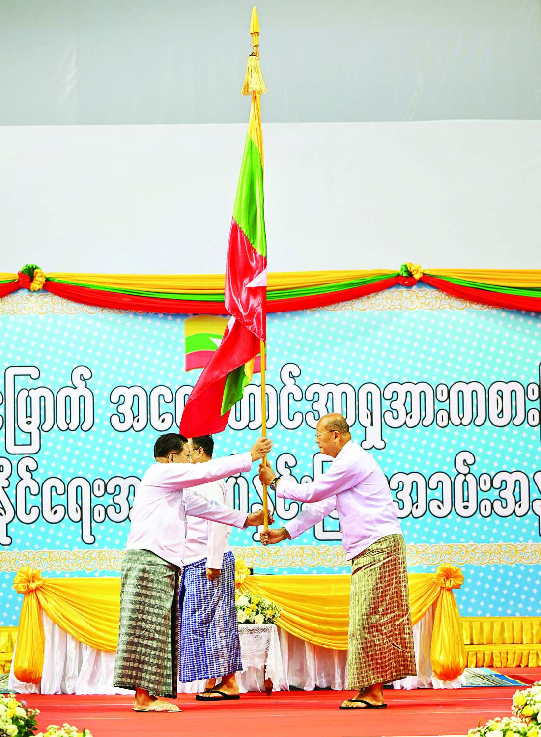 ယင်းနောက် နိုင်ငံတော်ယာယီသမ္မတ နိုင်ငံတော်လုံခြုံရေးနှင့်အေးချမ်းသာယာရေးကော်မရှင်ဥက္ကဋ္ဌက အားကစားနှင့်လူငယ်ရေးရာဝန်ကြီးဌာန ပြည်ထောင်စုဝန်ကြီး Jeng Phang နော်တောင် ထံ (၃၃)ကြိမ်မြောက် အရှေ့တောင်အာရှအားကစားပြိုင်ပွဲ အောင်နိုင်ရေးအလံအဖြစ် ပြည်ထောင်စုသမ္မတမြန်မာနိုင်ငံတော်အလံကို အပ်နှင်းသည်။